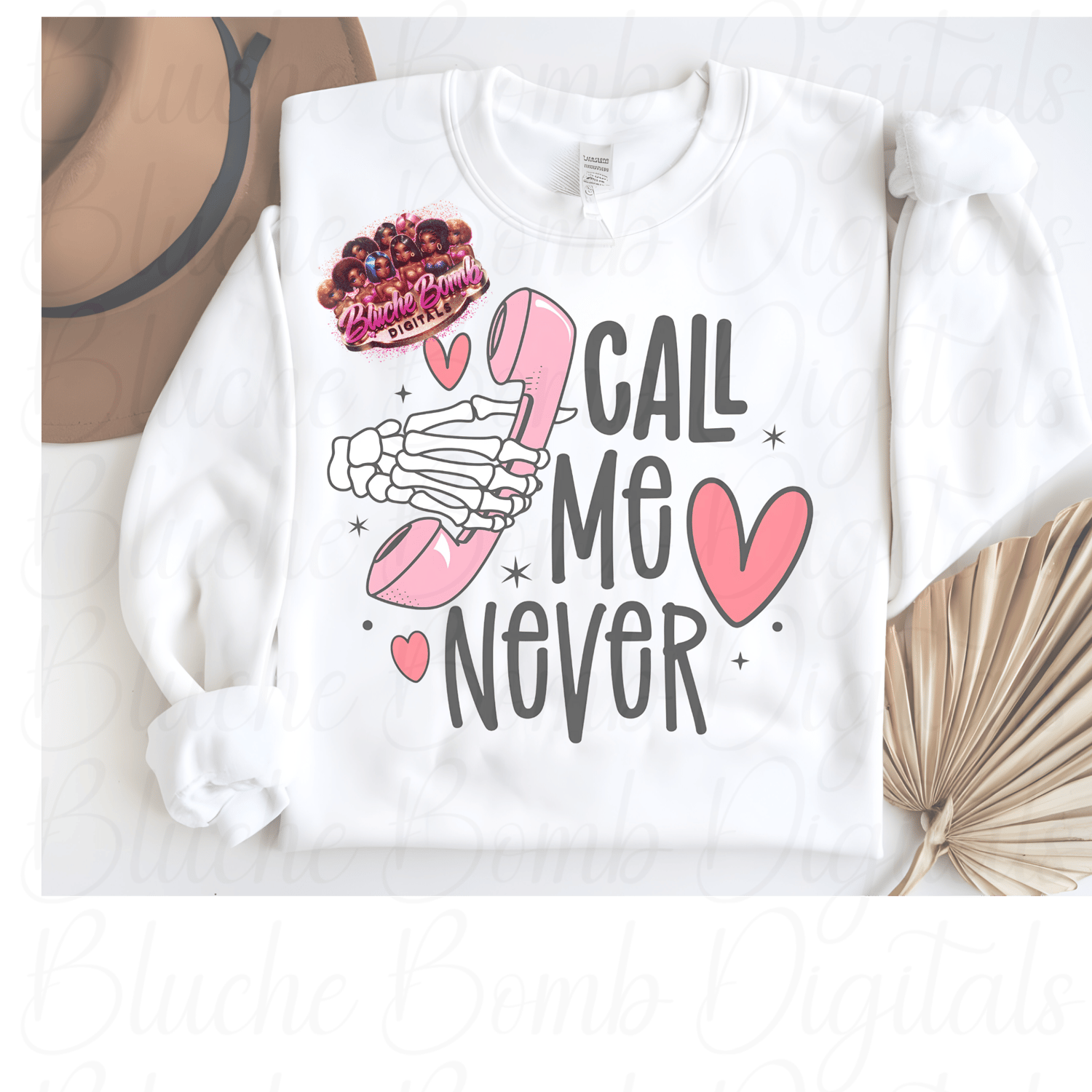 Make a bold, sassy statement with this "Call Me Never" digital design! Perfect for creating edgy T-shirts, mugs, totes, and more, this design blends humor with a retro vibe. Featuring a skeleton hand holding a pink rotary phone and playful hearts, this file is ideal for your DIY projects or crafting small business products.