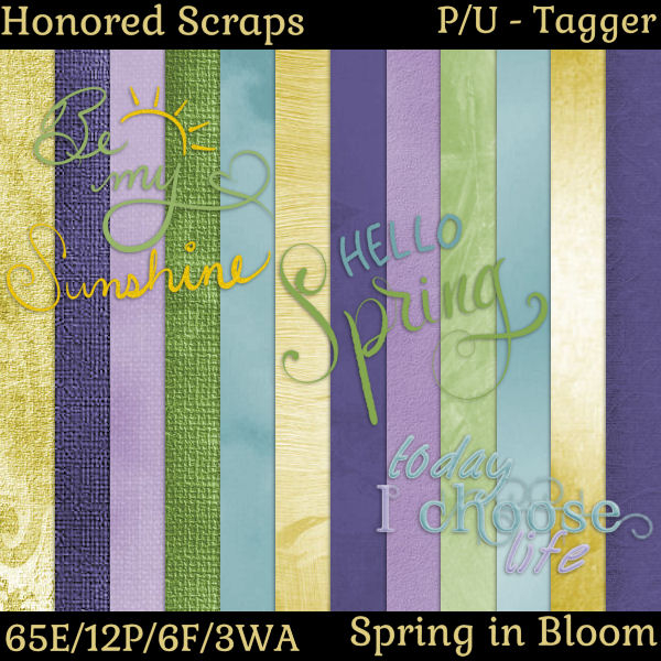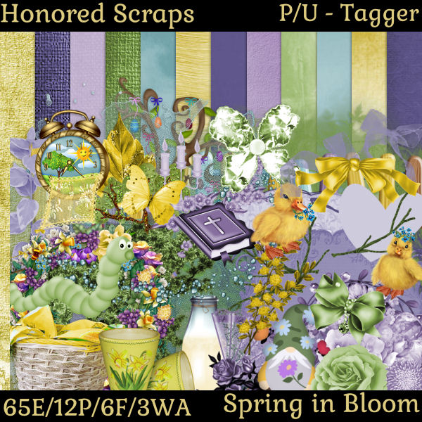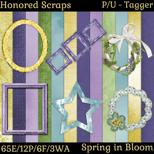 Spring in Bloom is a tagger kit that consists of 65 elements, 12 papers, 6 frames and 3 word art.