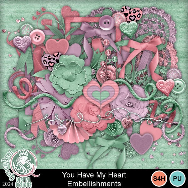 A beautiful "LOVE" filled kit perfect for Romance/Love/Valentine's Day/Passion theme projects. Contains a variety of paper and glitter hearts and flowers along with many other adorable elements and 15 awesome matching papers.
