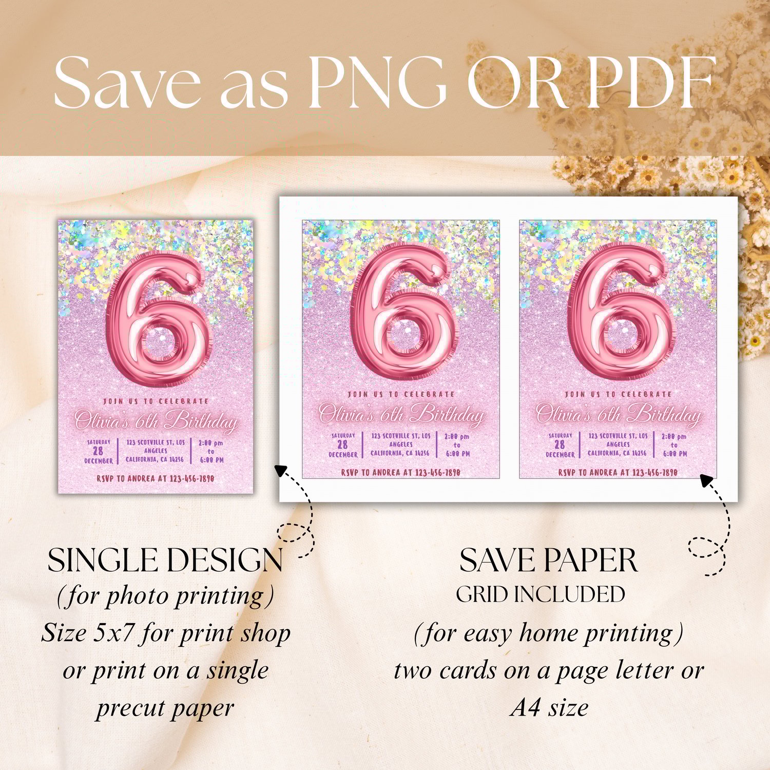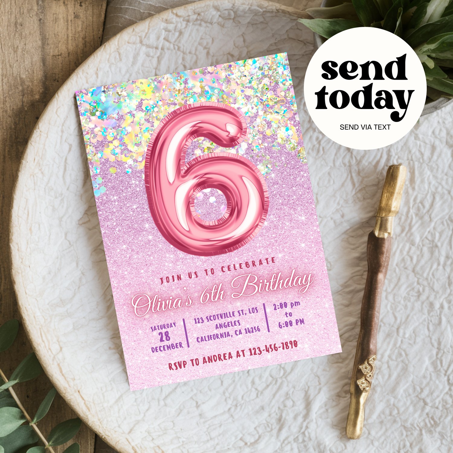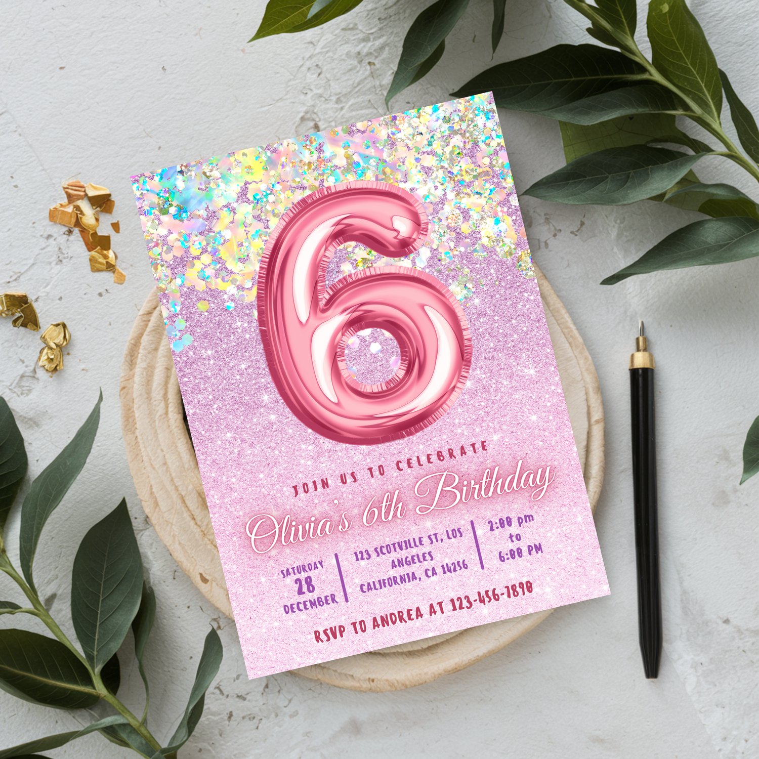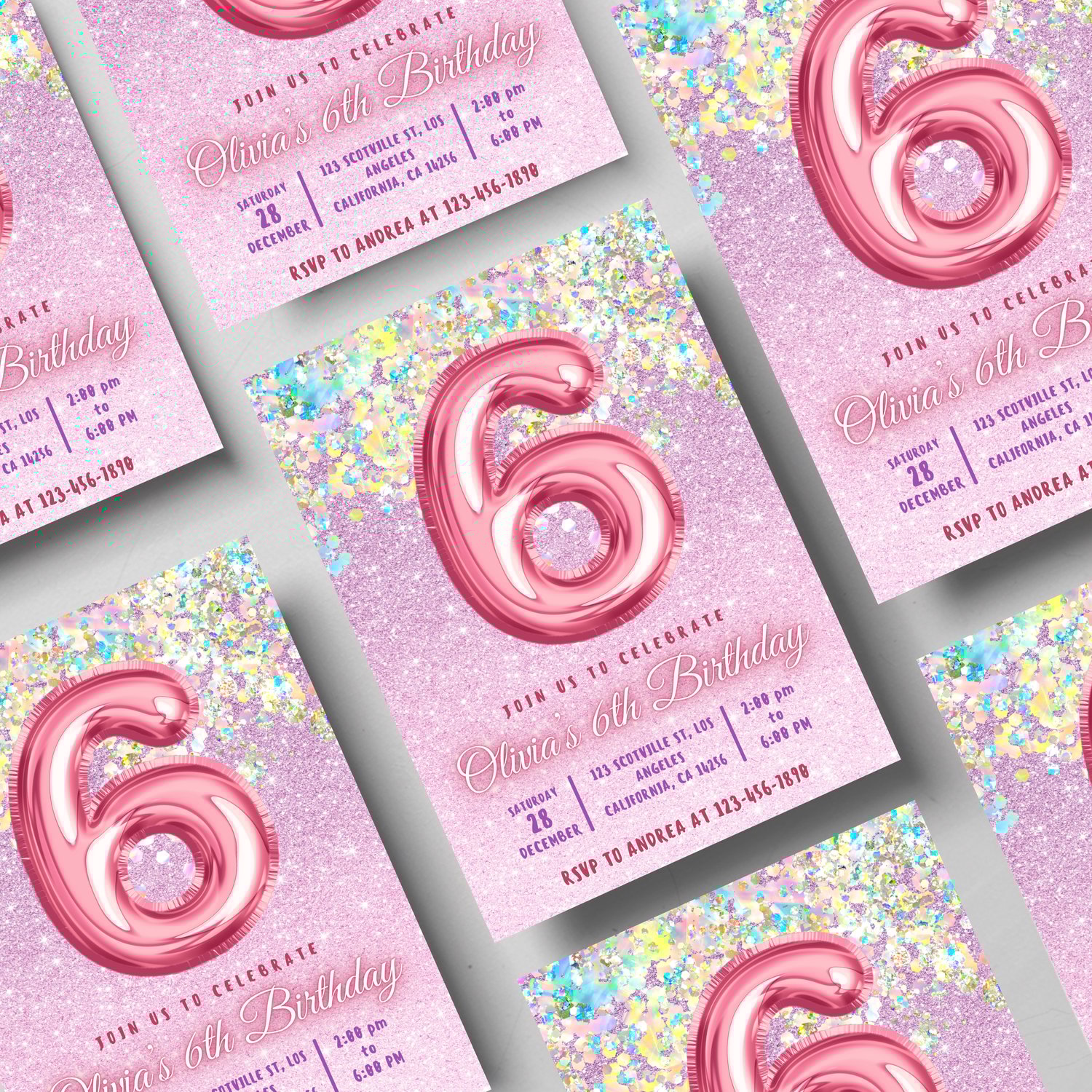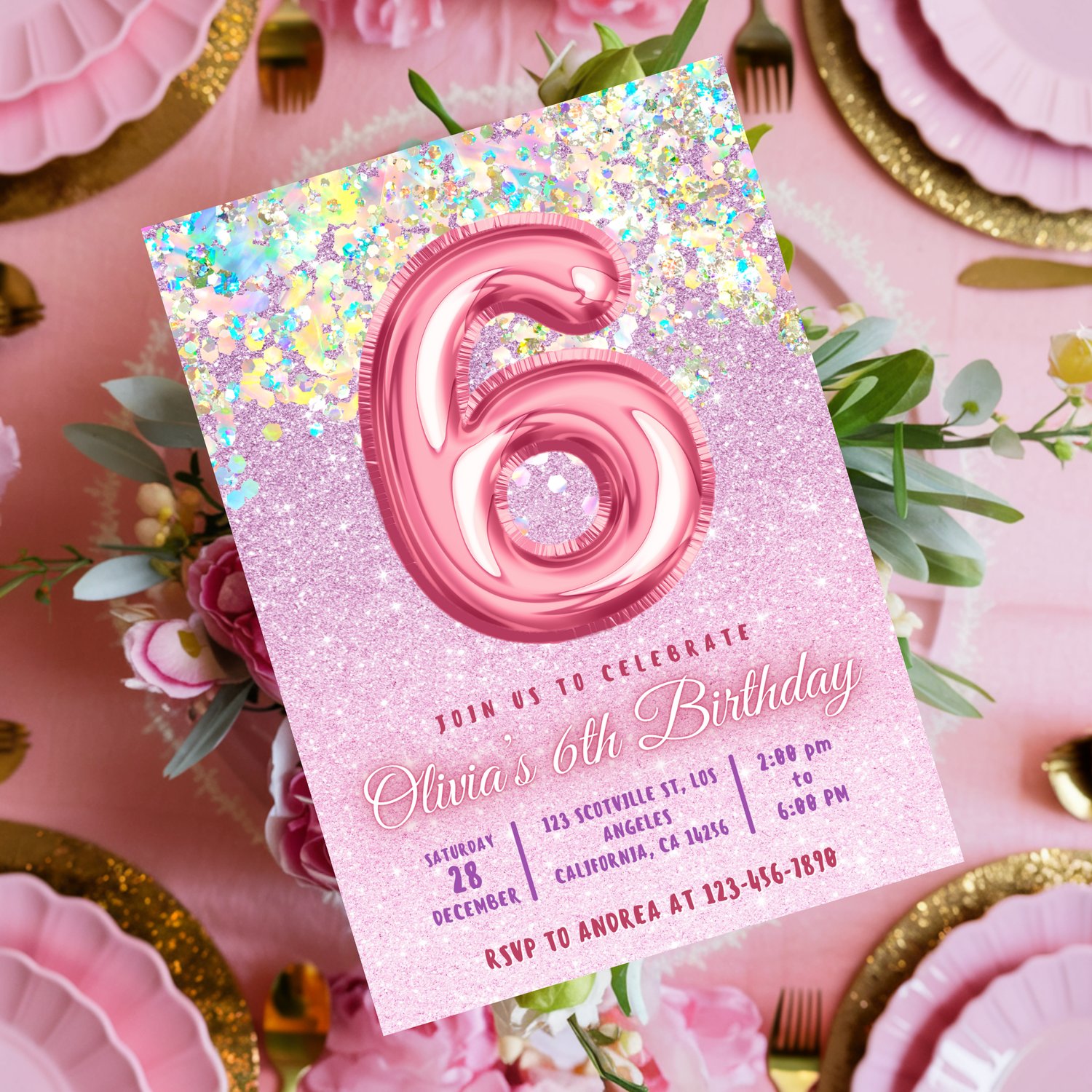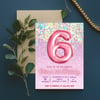 Editable Pink 6th Birthday Invitation Template Glitter Birthday Party Invite Rainbow Foil Girl Sixth Birthday Instant Download Digital