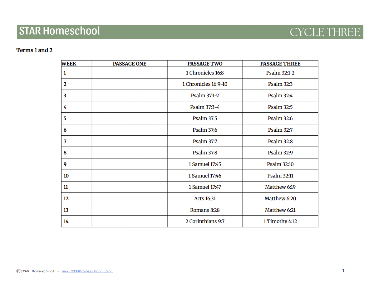 Claritas Publishing schedules a Bible passage each week for twenty-eight weeks. If you begin with Claritas when your child is in kindergarten, you will get through all four cycles three times. Because of that, I decided to create two alternative passages for each of the twenty-eight weeks. “Passage One” is blank, because that information can be found in the Claritas Publishing Cycle 3 memory work guide.