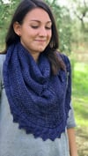 Those two key elements, the flowers and the stars, were my main inspiration and are directly portrayed in the shawl: you can see the flowers in the vertical insertion that is the spine of the shawl and the beautiful allover lace pattern that represents the starry sky extending throughout the two triangular wedges.
