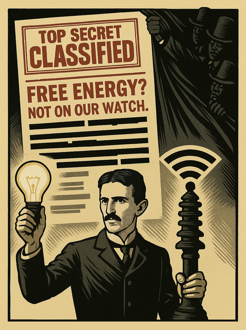 Make a bold statement with this thought-provoking graphic tee featuring a vintage-style design inspired by the legendary inventor Nikola Tesla. The artwork showcases a “Top Secret Classified” poster theme, with Tesla holding a light bulb and a wireless energy coil - symbolising his revolutionary ideas and the mysteries surrounding suppressed innovation.