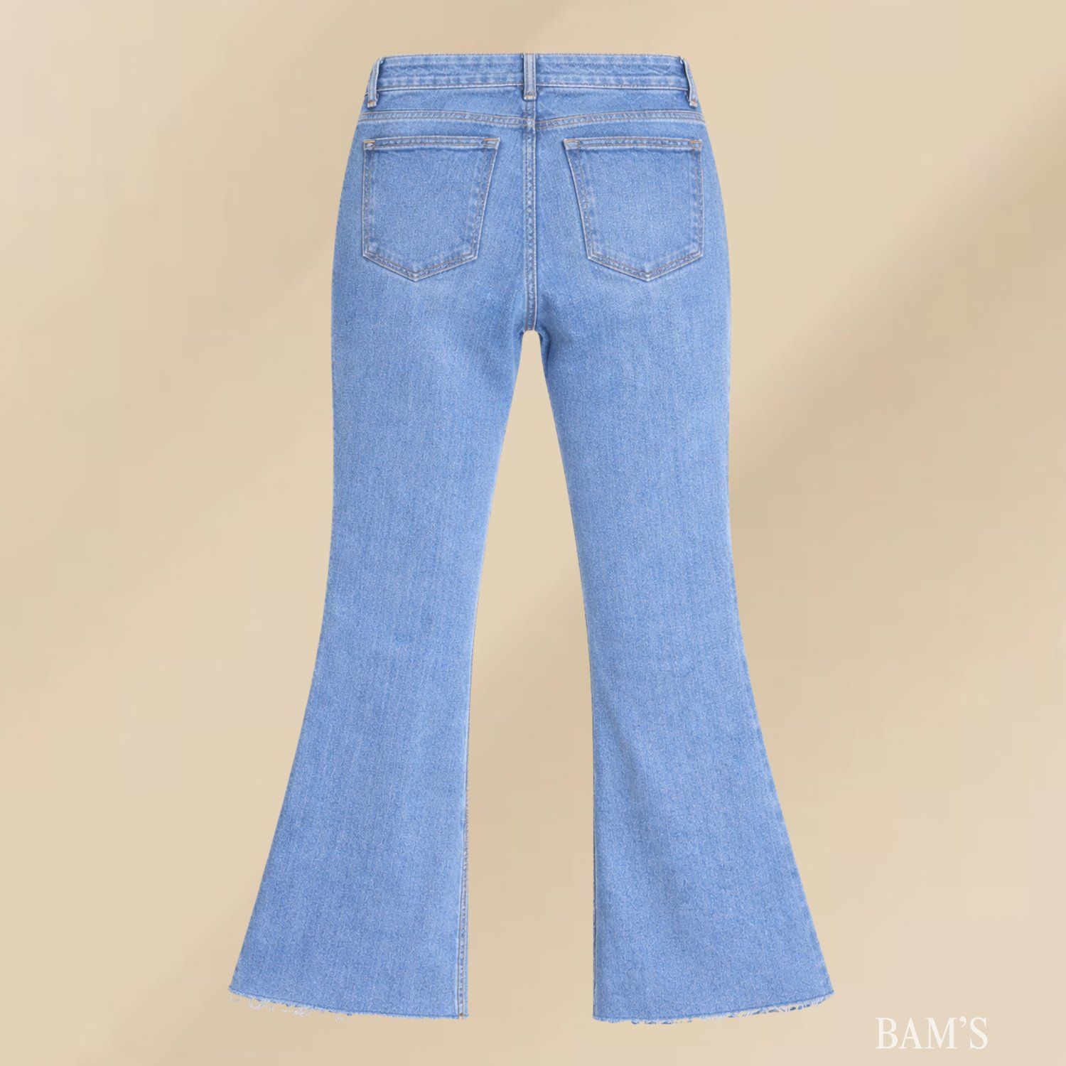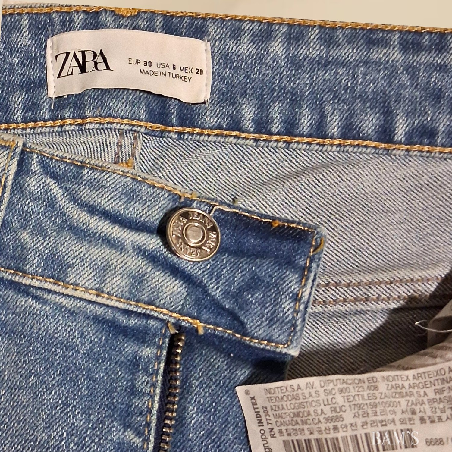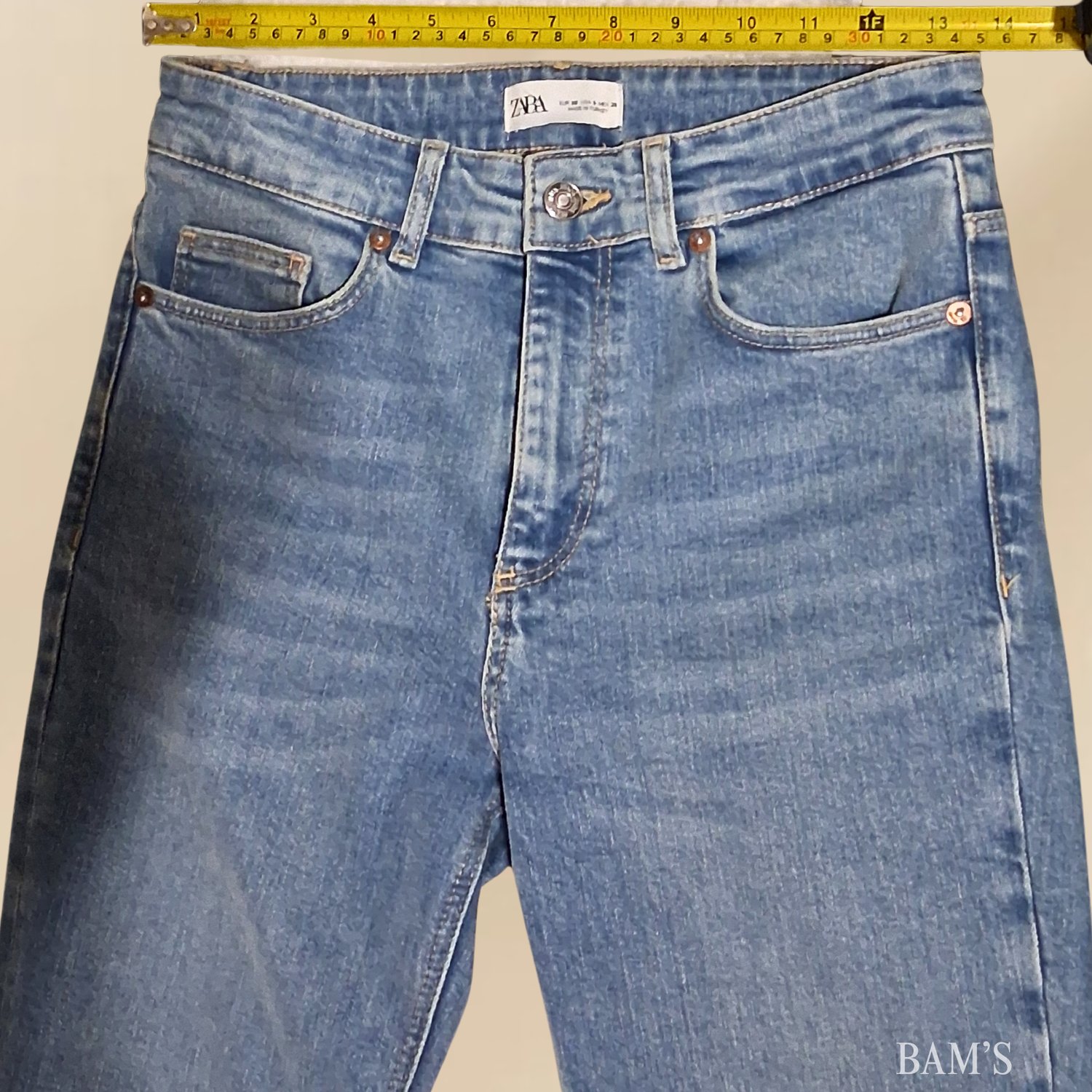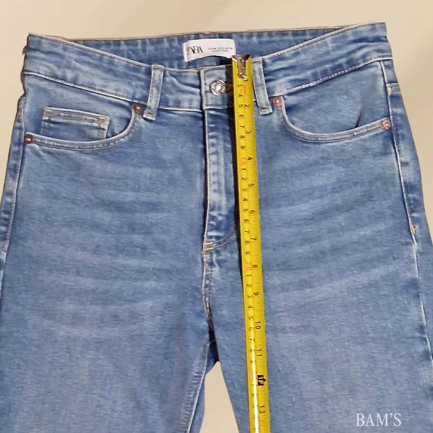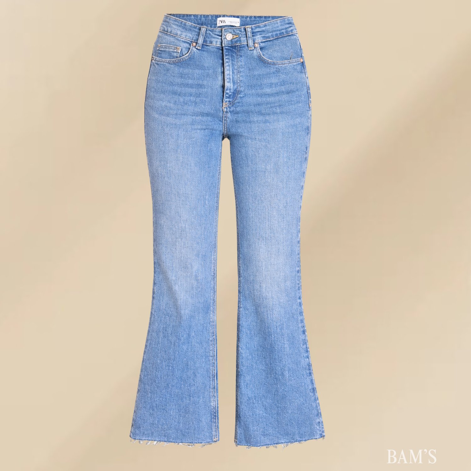 Zara cropped flare jeans in a flattering high-rise silhouette with a light wash finish. These feature a modern cropped length, subtle flare leg, and raw hem detailing for an effortless, on-trend look.