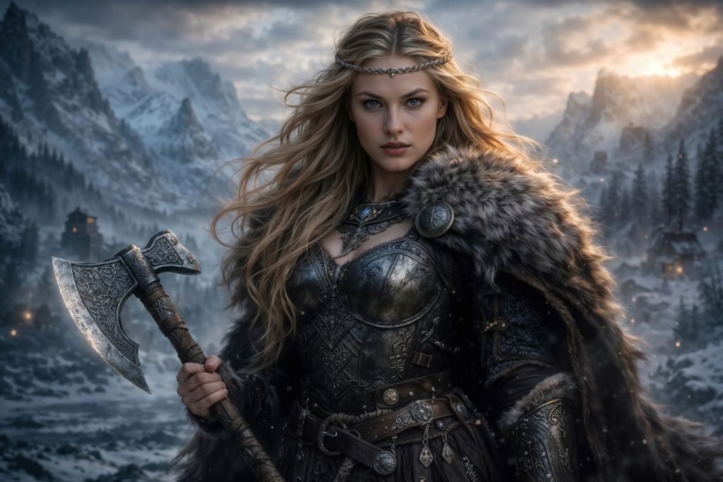 This true 10K Viking artwork captures a northern shieldmaiden carved from storm and steel: fur cloak heavy on her shoulders, rune-etched armor catching cold light, and a finely worked axe held with calm certainty. Behind her, snow drifts through a vast mountain valley as distant lights flicker like small defiance against the frost—an image that feels timeless, fierce, and quietly majestic.