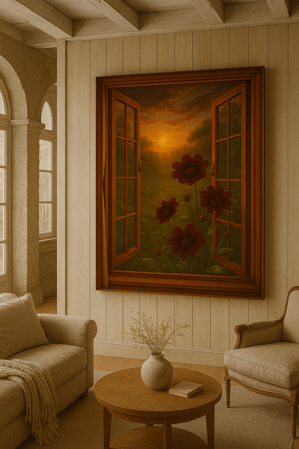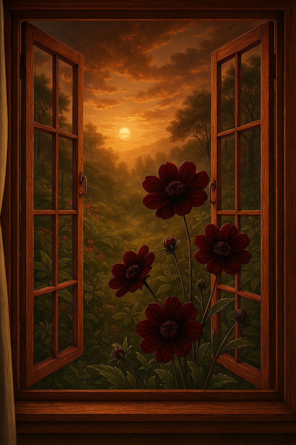 This richly atmospheric digital artwork invites you to gaze through a rustic wooden window into a blooming valley bathed in golden light. At its heart, the deep burgundy Chocolate Cosmos (Cosmos atrosanguineus) exude warmth and mystery — a rare Mexican flower known for its scent of dark chocolate and its velvety petals.