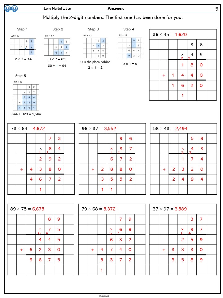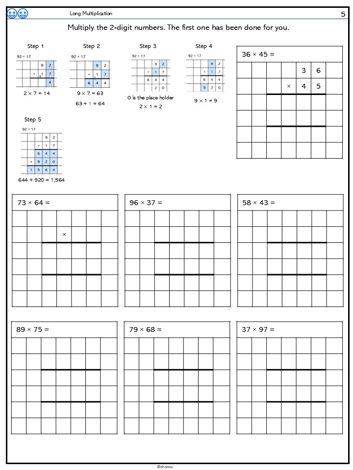 Children practice long multiplication multiplying 2-digit number by 2-digit number.