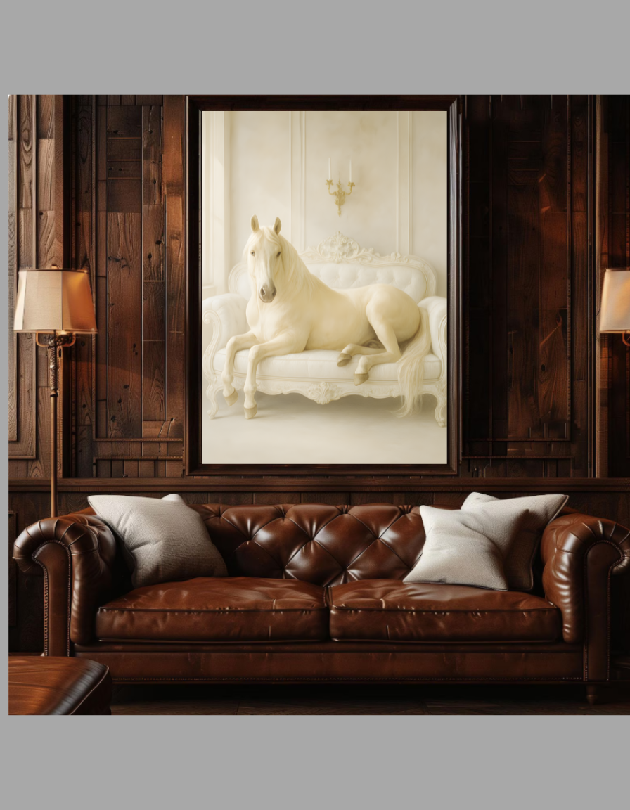 - Funny horse print: Captures a serene yet playful white horse relaxing on a creamy ornate sofa against soft beige walls with classic sconce lighting.