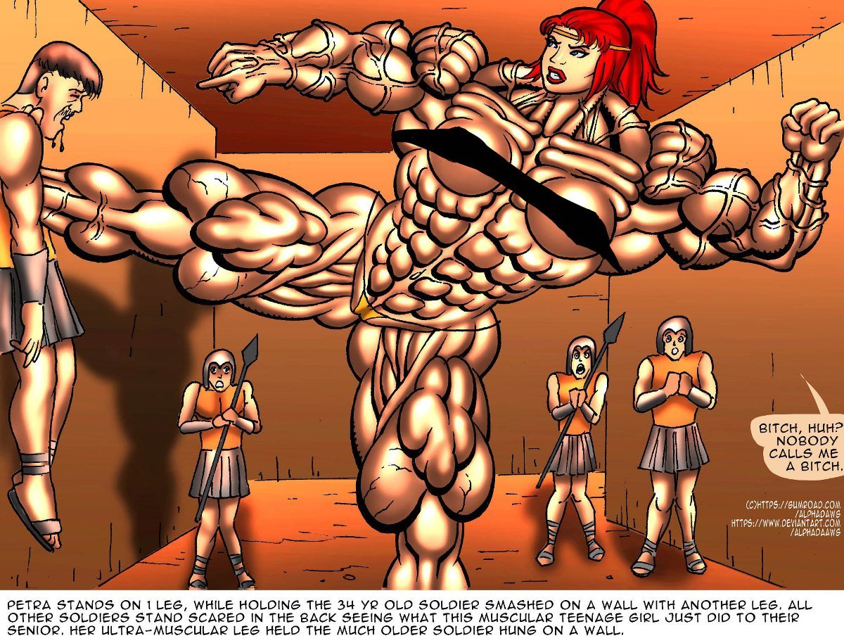 BUFF, 18 y.o., TEENAGE AMAZON, PETRA is a GLADIATOR in a Roman Colosseum of Death. She uses her BUFF MUSCULAR BODY to slay her male opponents everyday, for her own life. But today is her lucky day, meeting some good men, whom she impresses by FLEXING her BICEPS and showing the limits of her HARD MUSCULAR PHYSIQUE. PETRA uses her superior MUSCULAR STRENGTH and feminine persuasion to own everyday in this deadly GLADIATOR ARENA.