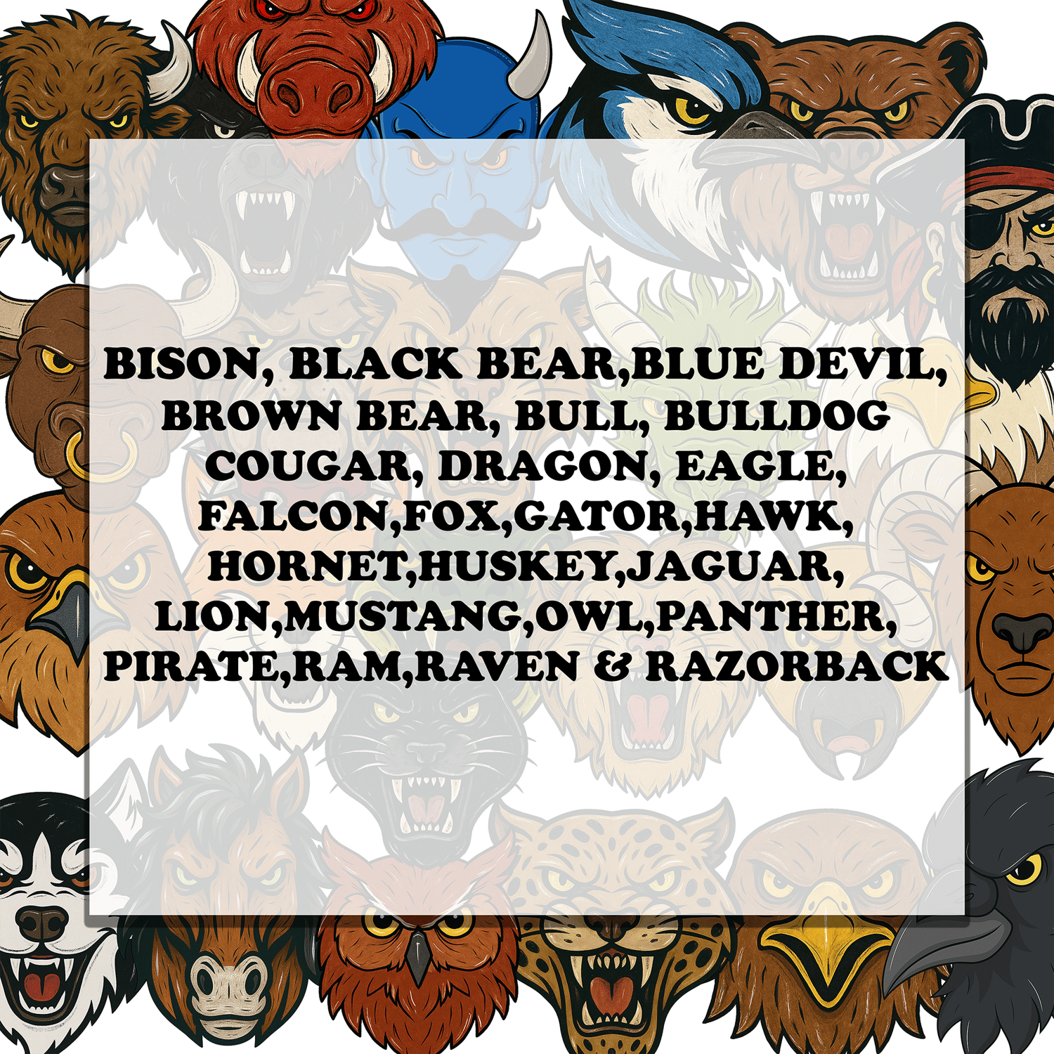 COUGAR,DRAGON,EAGLE,FALCON,FOX,GATOR,HAWK,HORNET,HUSKEY,JAGUAR,LION,MUSTANG,OWL,PANTHER,PIRATE,RAM,RAVEN,& RAZORBACK