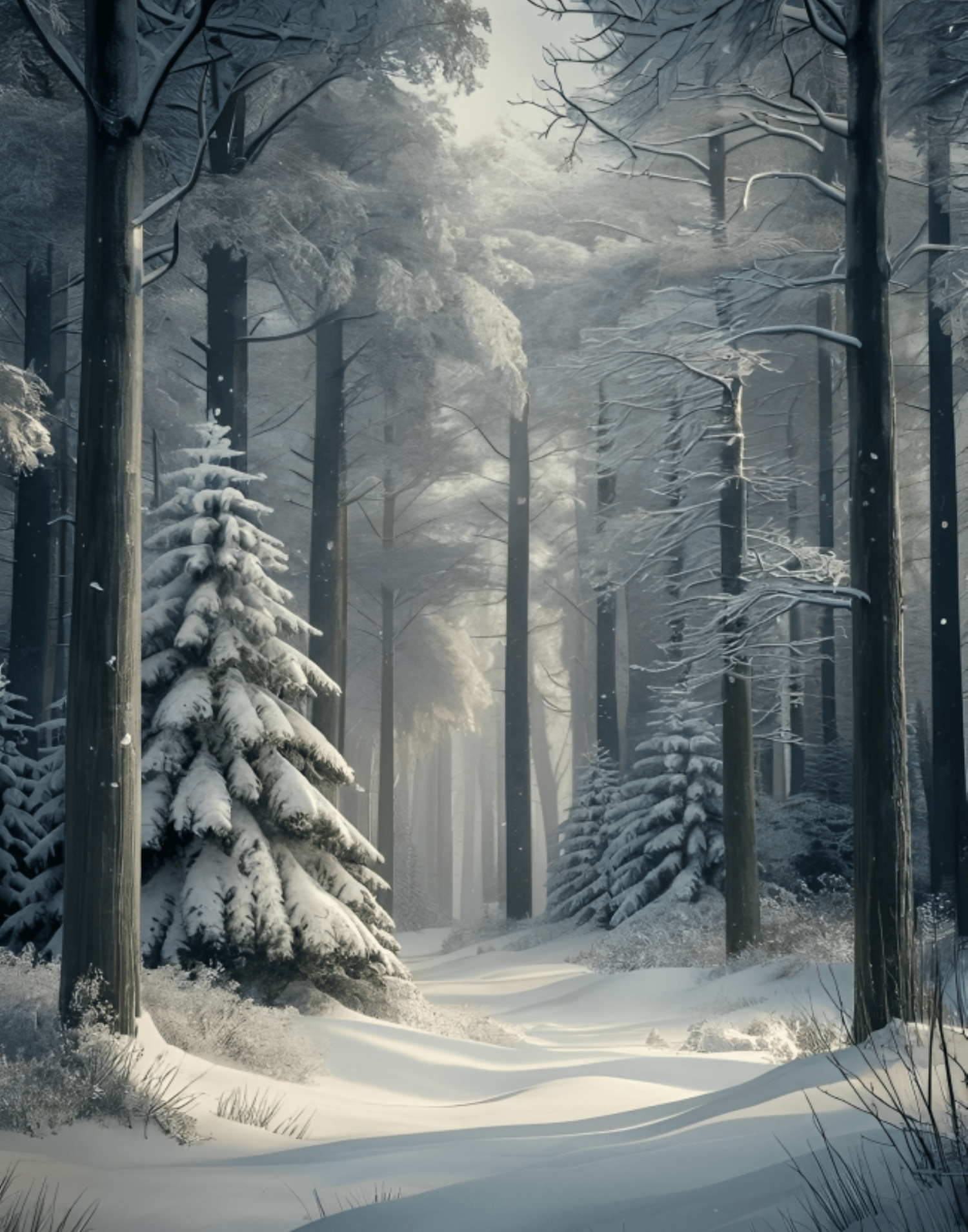 Snowy Forest Landscape, Winter Forest, , Nostalgic Nature, Cool Nature, Rustic natural Landscape, Painting.