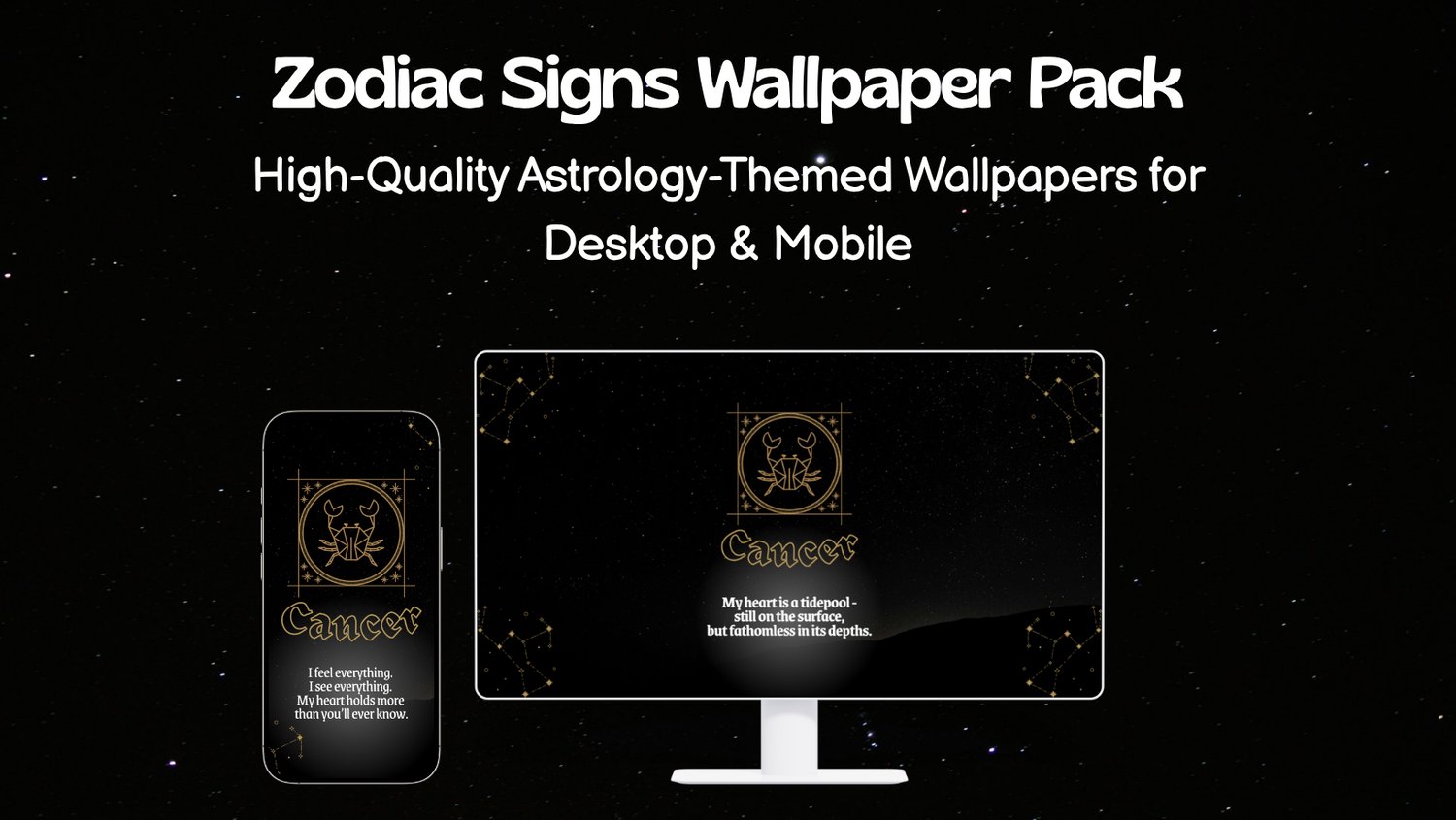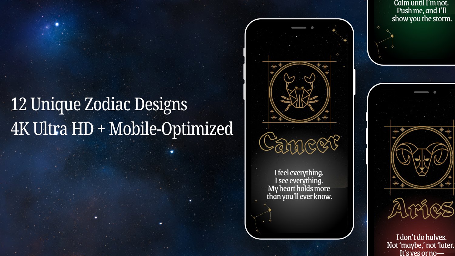 ✔ 12 Zodiac Wallpapers (Aries to Pisces) – 4K Ultra HD for desktop + mobile-optimized versions.