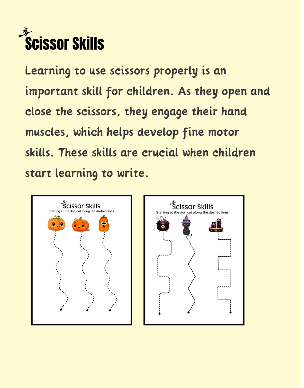 Happy Halloween Scissor Skills 25 pages, fine motor skills, improve hand-eye coordination