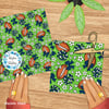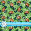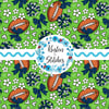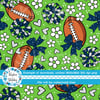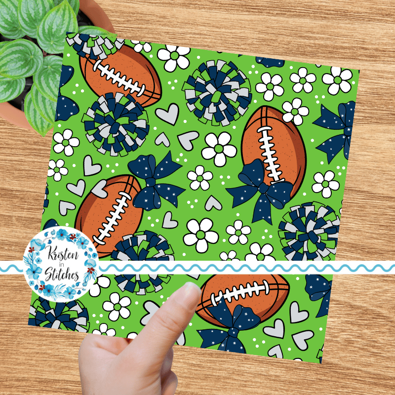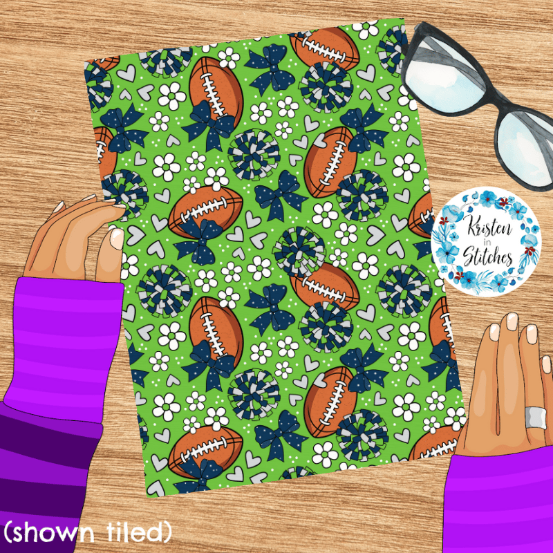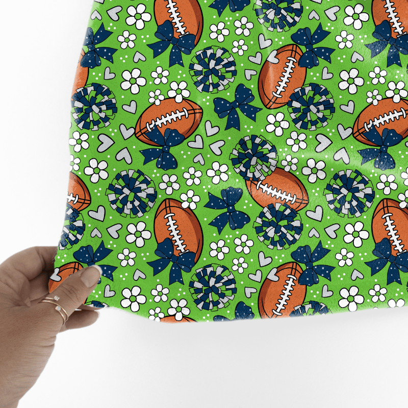 Floral pattern with daisy flowers, cheerleader bows, pompoms, footballs and hearts in Seattle Seahawks colors action green and navy blue on a green background.