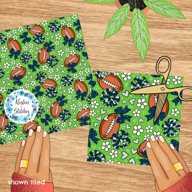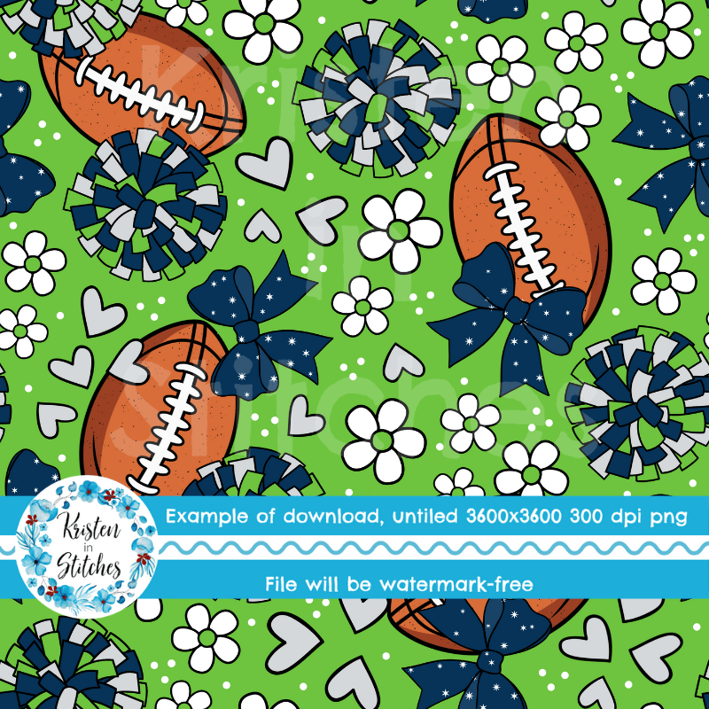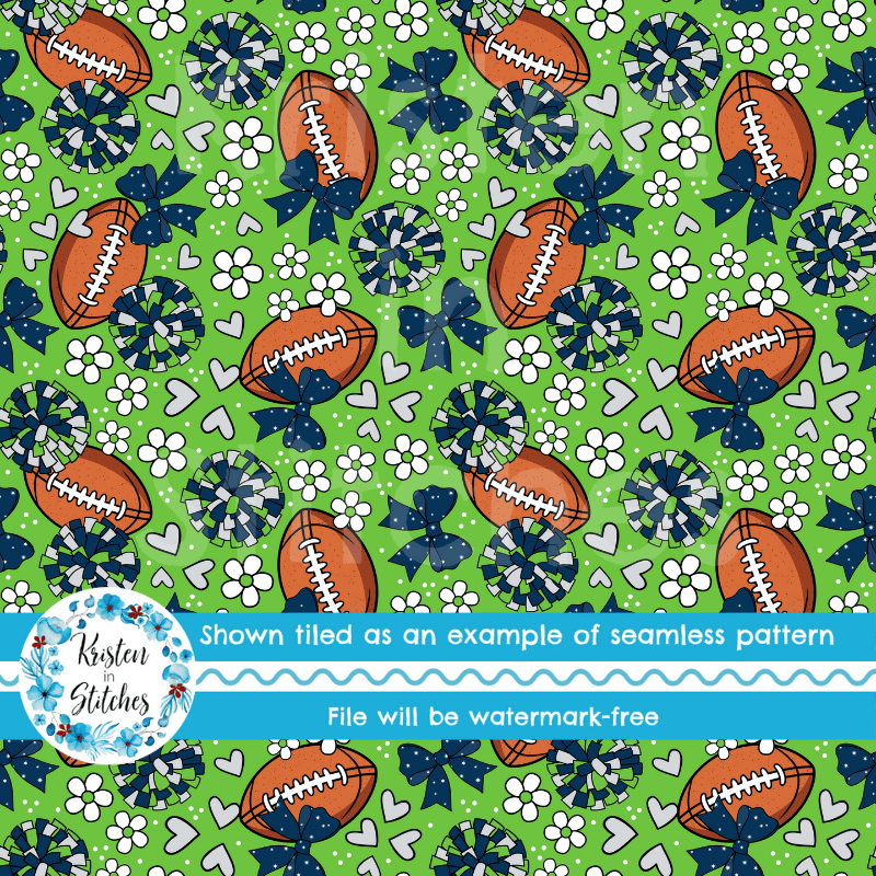 Football Cheer Bows and Pom Poms Seamless Pattern, Seattle Seahawks Green and Blue