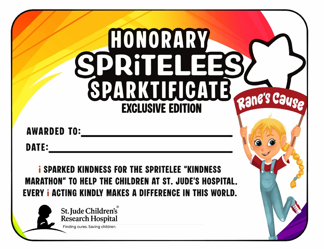 Want to give more? Visit our St. Jude SPRiTELEE Kindness Marathon page — donations of $50 or more receive Rane’s Rescue (the animated eBook), a coloring book, and this special Sparktificate as our thank-you gift.