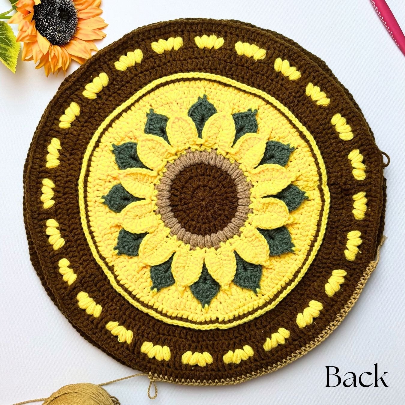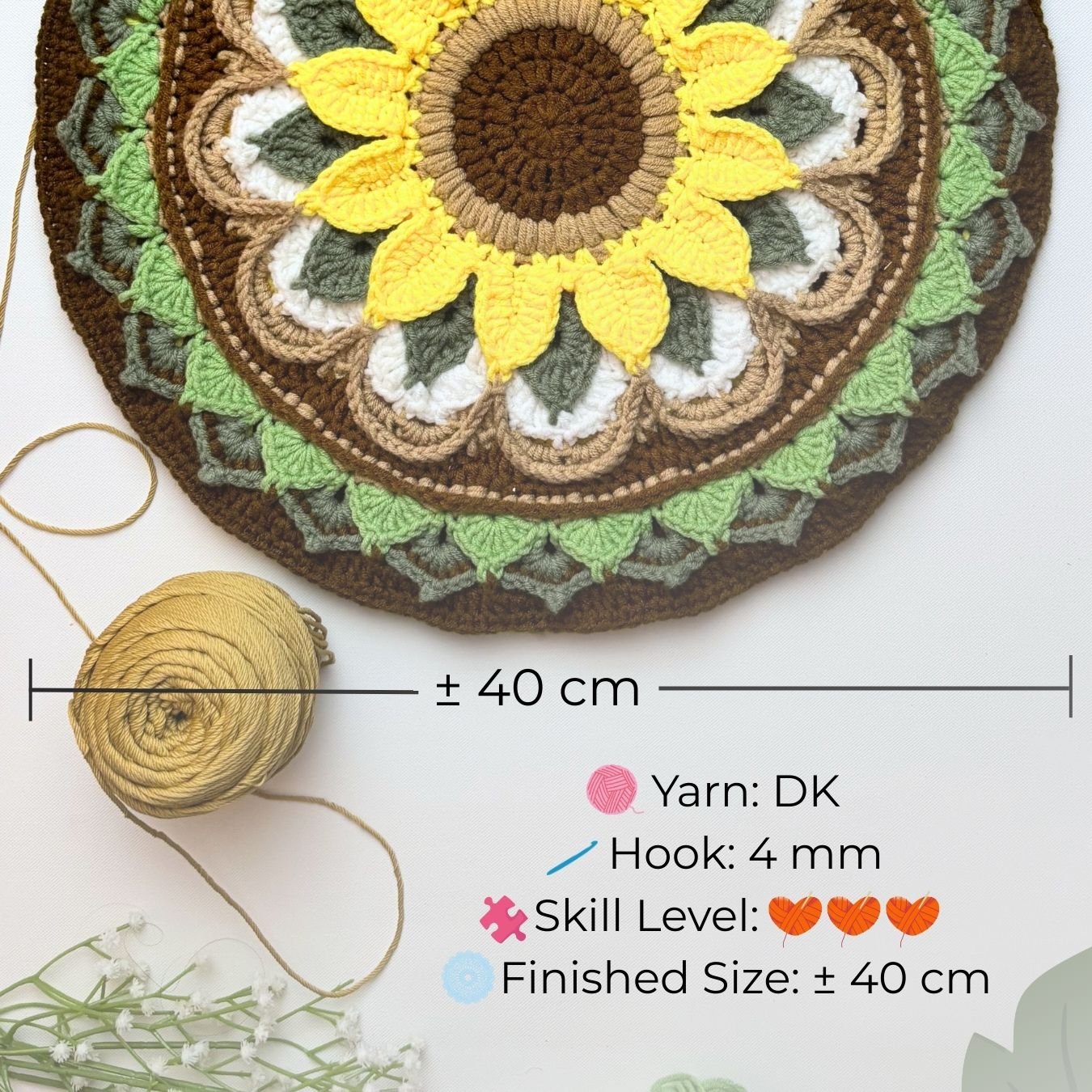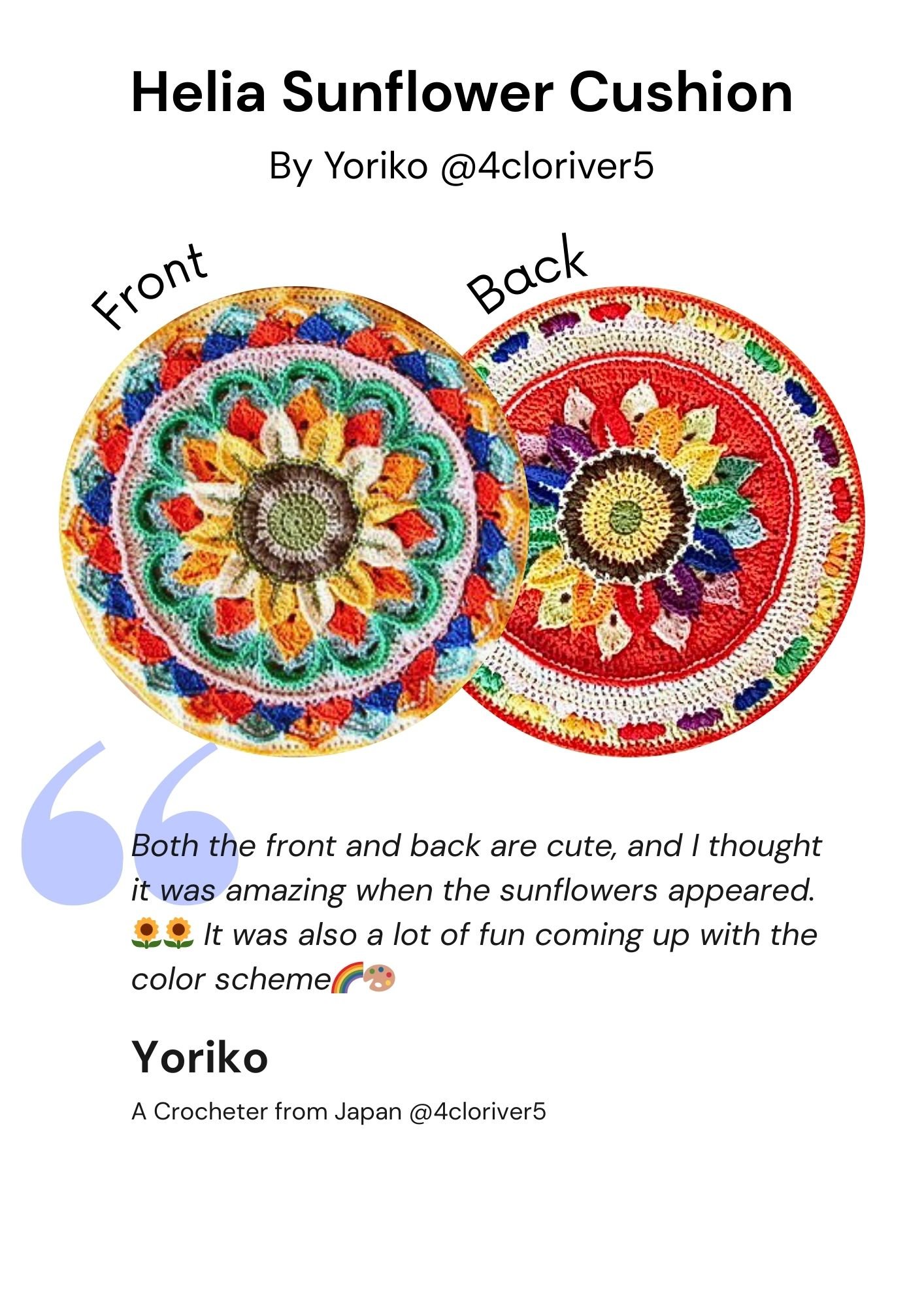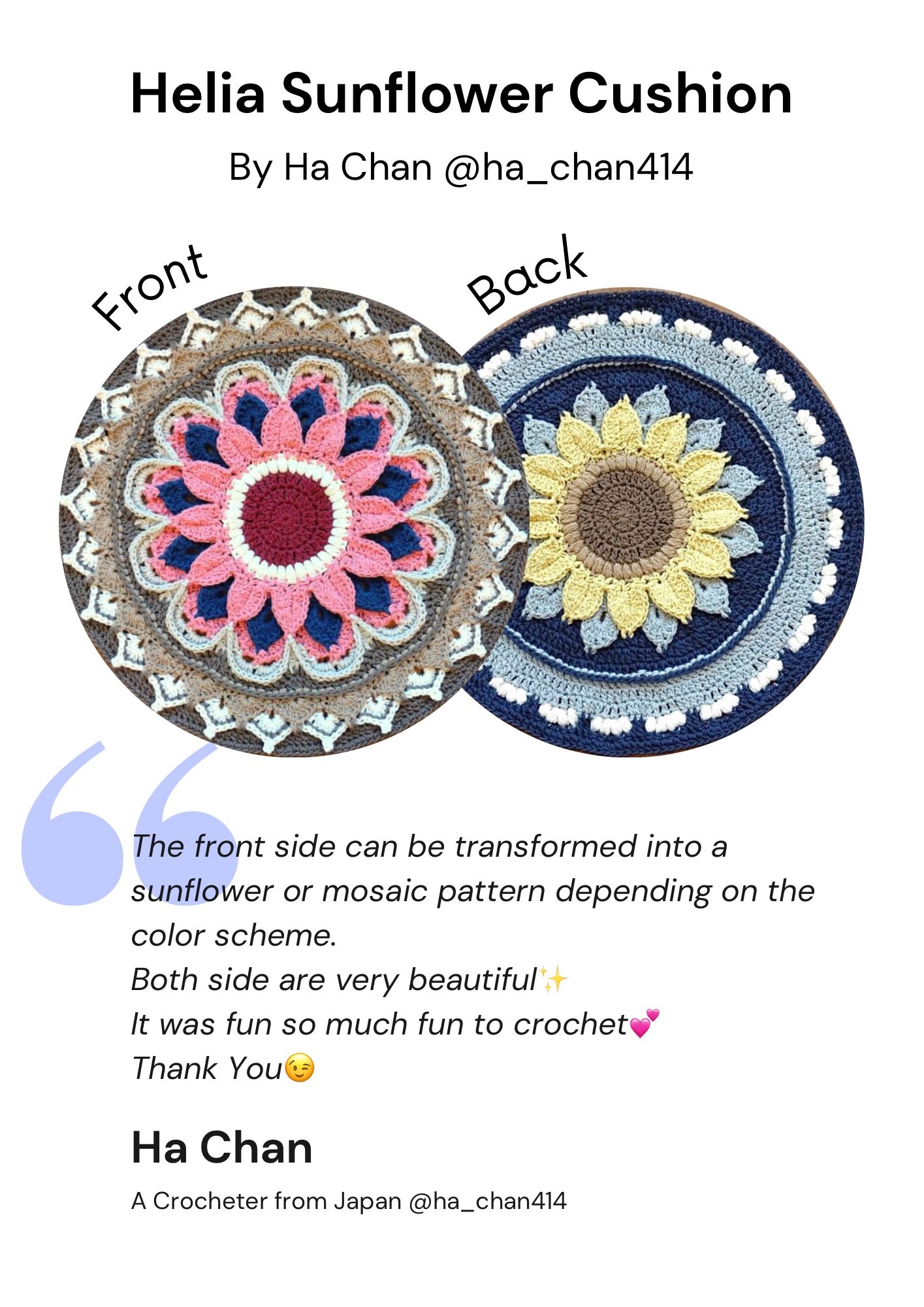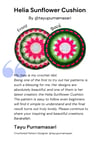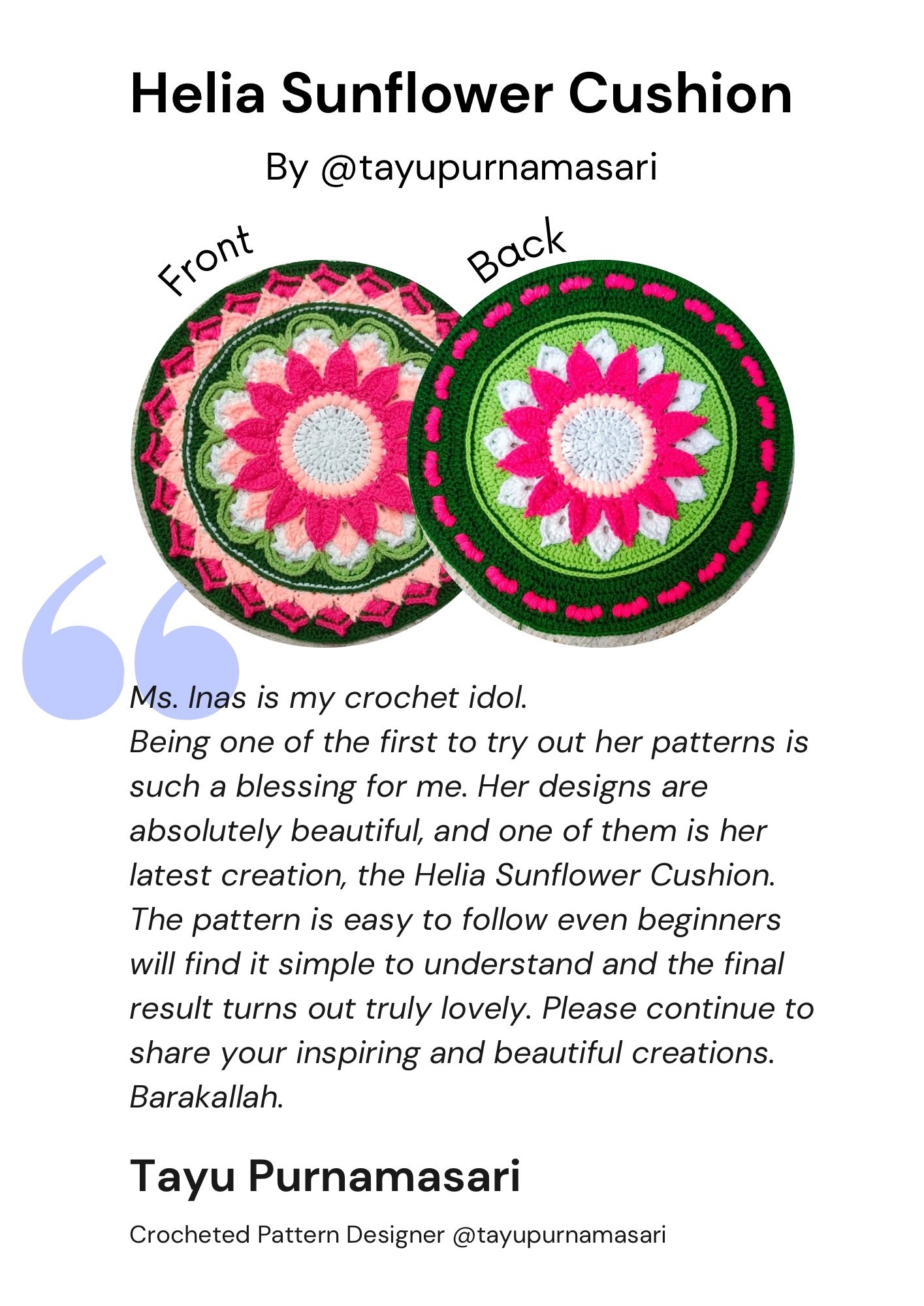 - The Helia Sunflower Cushion Pattern, complete with step-by-step photos, chart, and video tutorials (in Indonesian with auto translation on youtube) you can access anytime—lifetime access! (valued at $9.90)