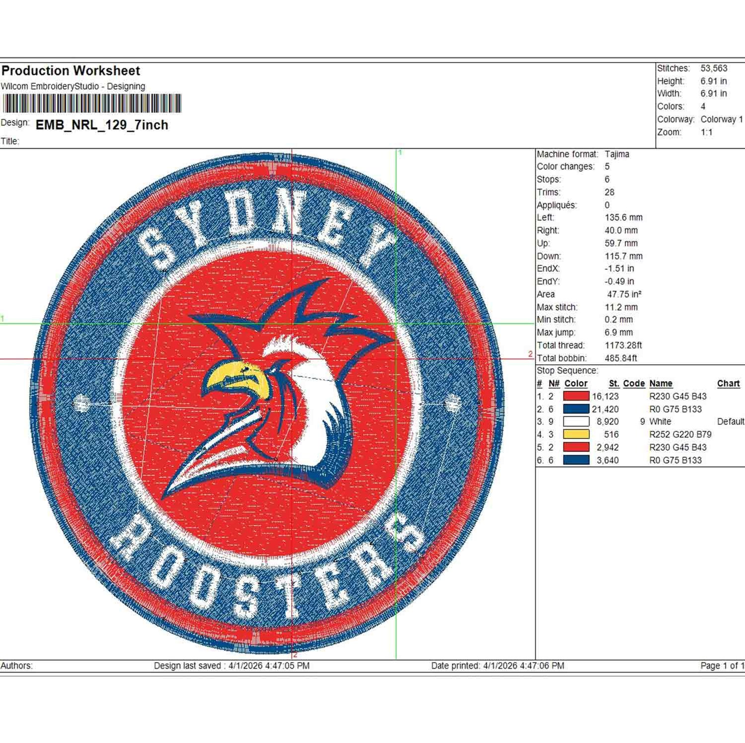 Sydney Roosters Round Logos Embroidery Designs, NRL Sydney Roosters Team Logo Embroidery, Rugby League Machine Embroidery Design, Digital Dowload