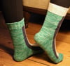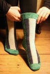 Yarn: Regia 4 ply 1 skeins 75% wool, 25% polyamide; 210 meters per 50g ball as MC, shown in green, 15g (0.53oz) each of CC, shown in violett and undyed.