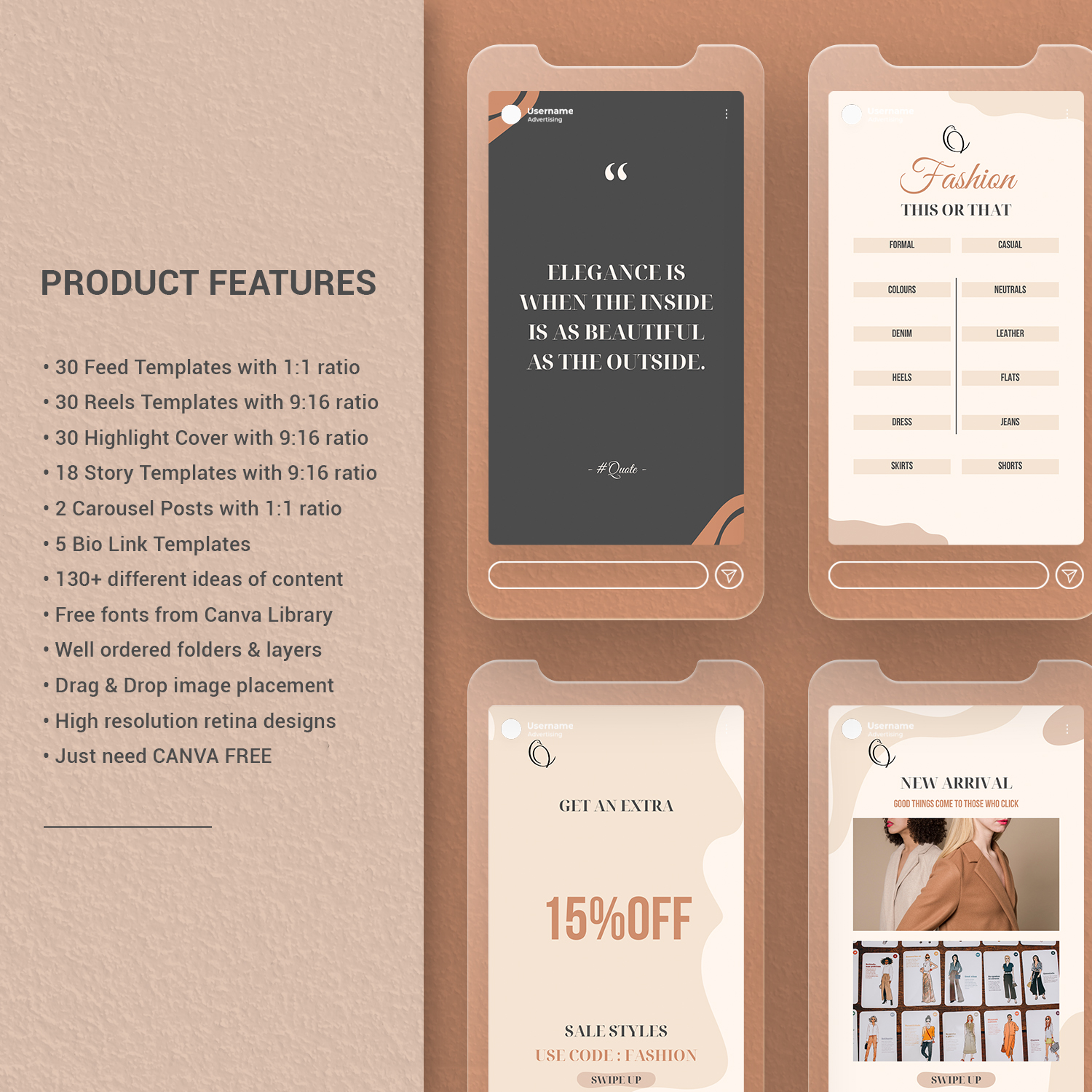 - 30 Instagram Post Templates: Elegant, neutral-toned designs perfect for showcasing your fashion collections, promotions, and brand stories.