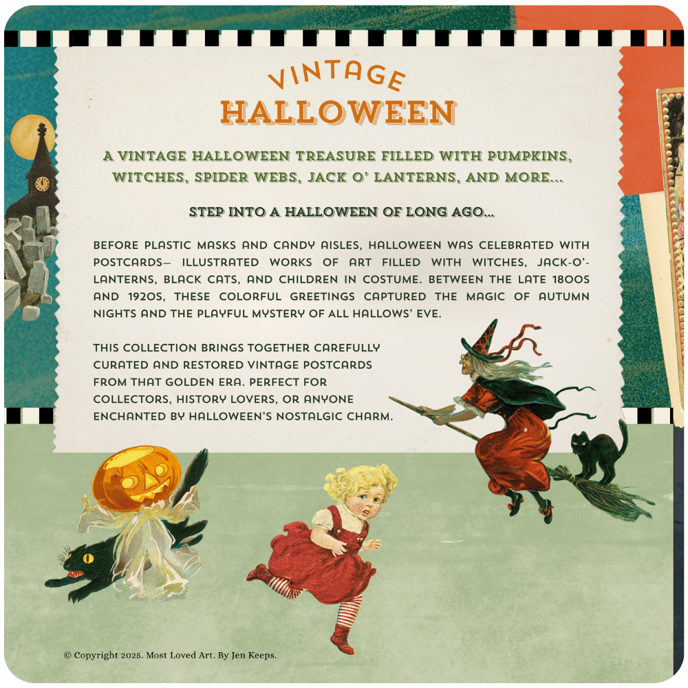 Vintage Halloween Postcards book is filled with pages of vintage illustrations and postcards from the golden age of postcards when sending mail and postcards became a lot less expensive. Instant digital download allows you to download and print instantly.