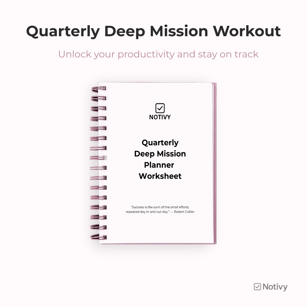 The Quarterly Deep Mission Planner is more than just a planner — it’s your personal mission control for the next 3 months. Designed to help you dig deeper, stay focused, and take consistent action, this planner guides you step by step to achieve the goals that matter most.