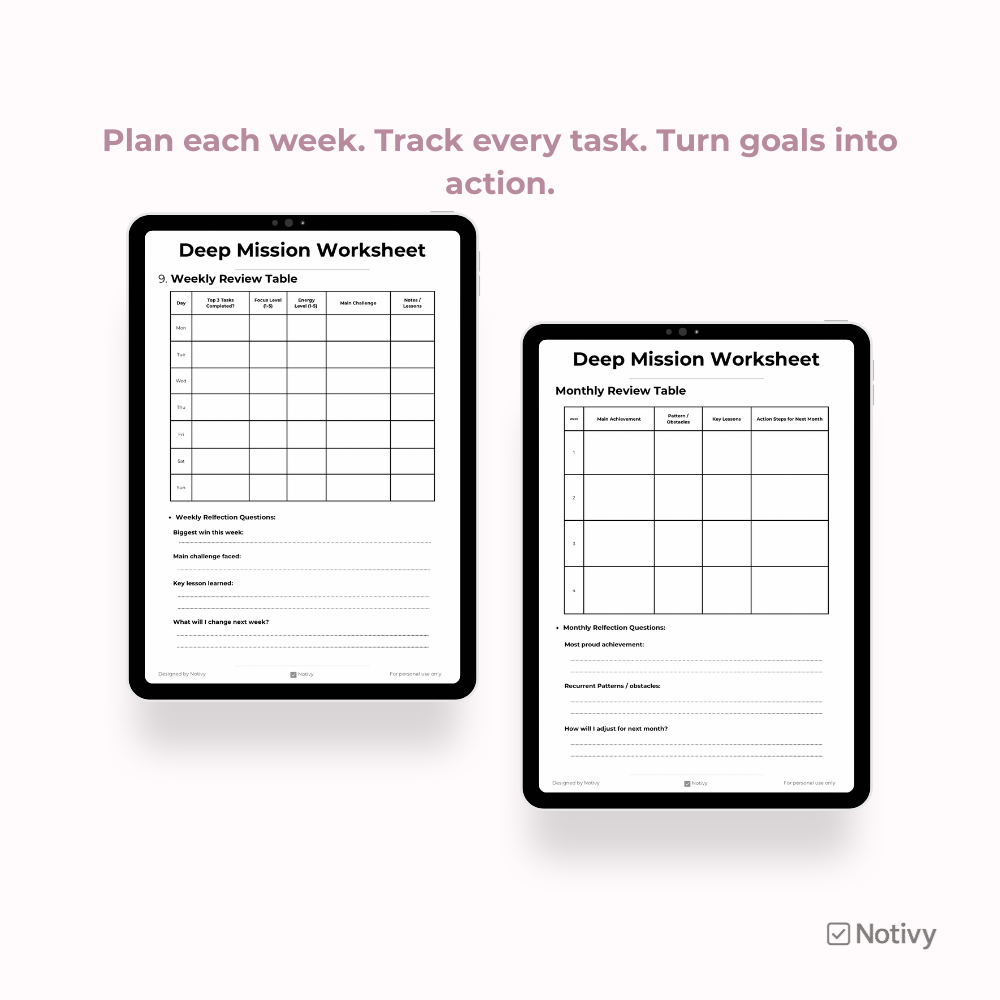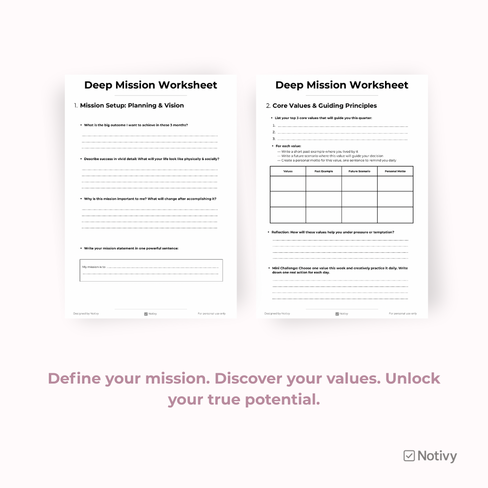 ✅ 12 deep mission sections — one for each week, focusing on vision, values, strengths, obstacles, strategy, and growth.