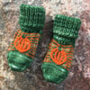 Fold-over ribbed cuffs help keep these on little feet and slipped-stitch pumpkins add some seasonal fun.