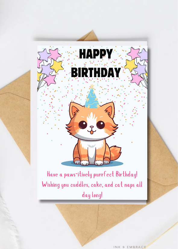 Celebrate someone’s special day with this purr-fectly adorable cat-themed birthday card! Featuring a cartoon kitty in a party hat, this printable birthday card is ideal for cat lovers of all ages. Just download, print, and bring instant smiles! Perfect for friends, family, kids, or anyone who loves cute animals.