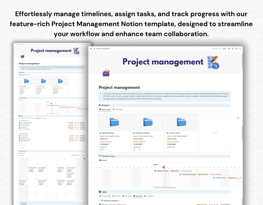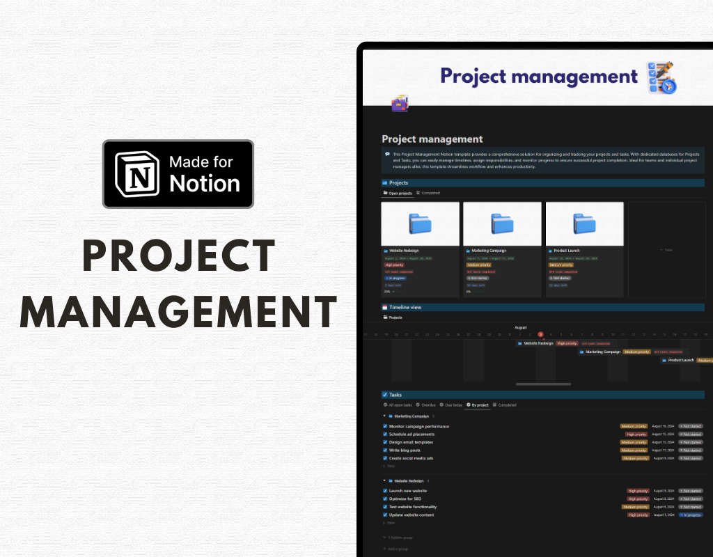The Project Management Notion template is a robust and versatile tool designed to help you effectively organize, manage, and track all aspects of your projects. This template features dedicated databases for Projects and Tasks, providing a clear structure for managing multiple projects simultaneously.