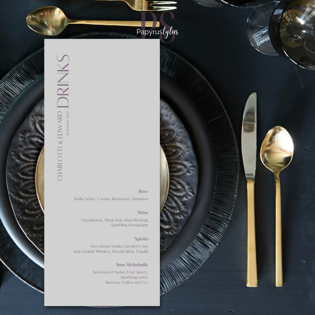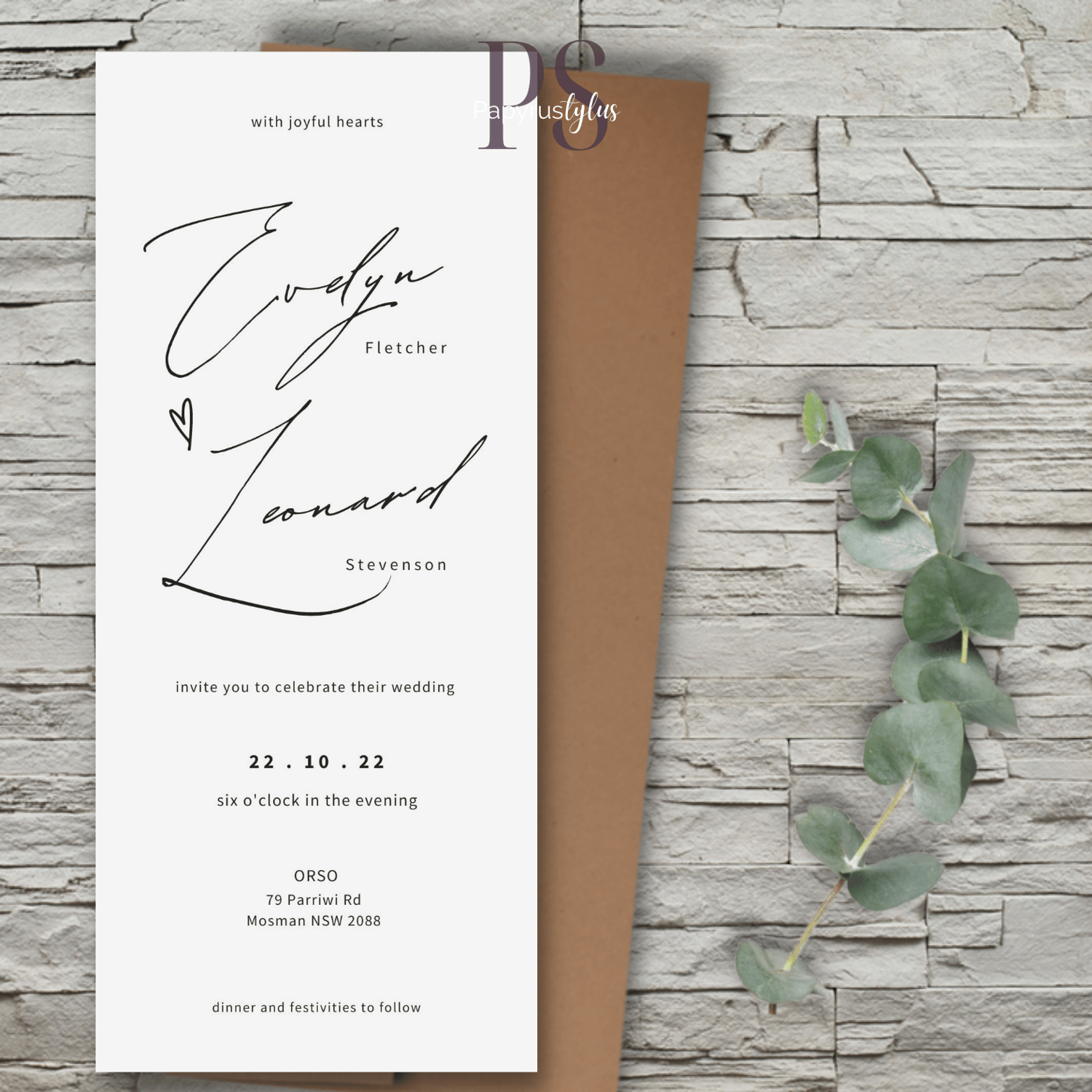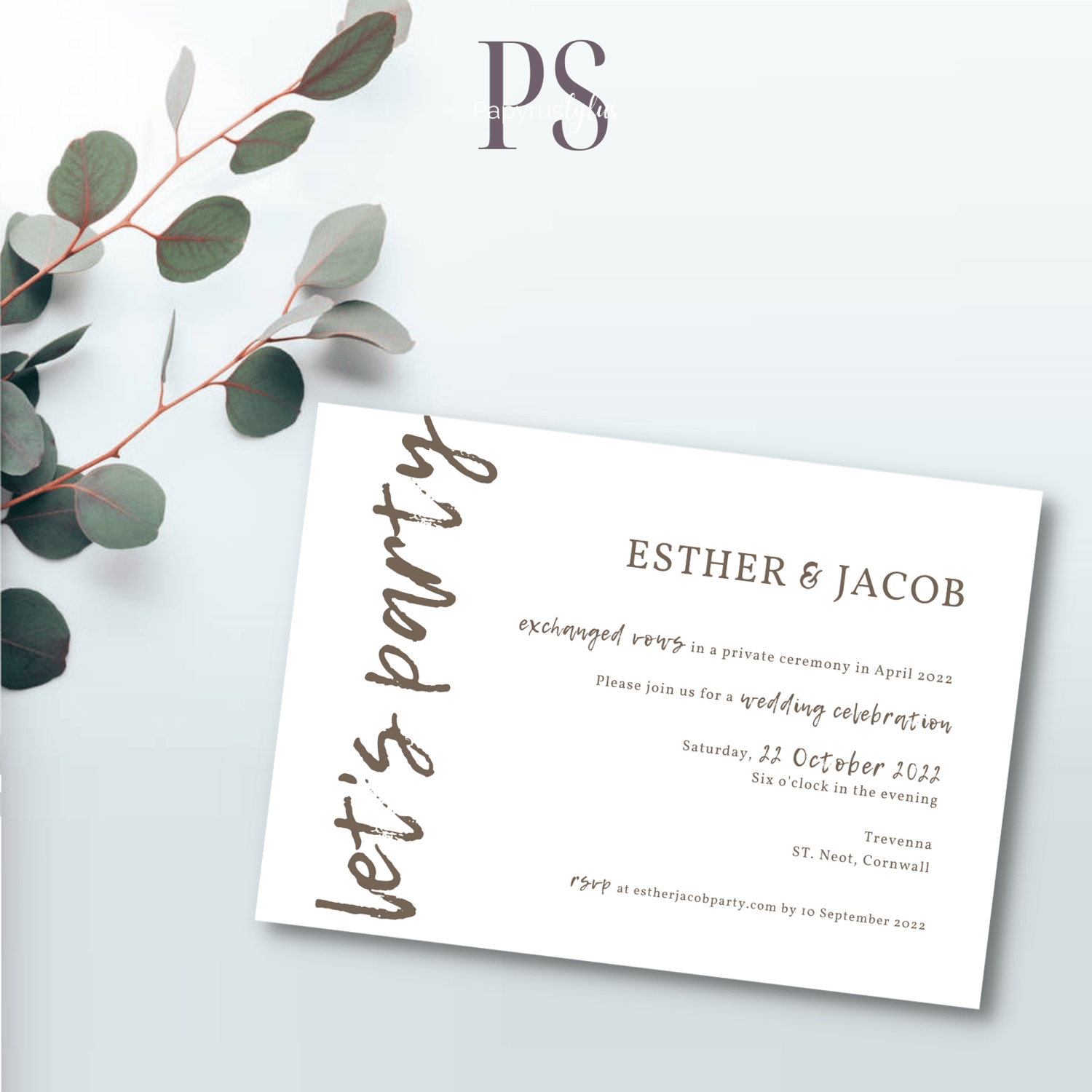 An unconventional wedding invitation design where couple's names and all event details are lined up evenly against the left and right margins in different fonts, sizes and colours, and thus adding a little touch of playfulness.