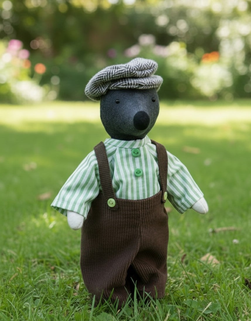 Here we have Morris the Mole he stands About 10inch high and is made in a wool mix felt, Morris comes complete with the pattern for his clothes, he loves to spend the day in the garden among the cabbages and peas.