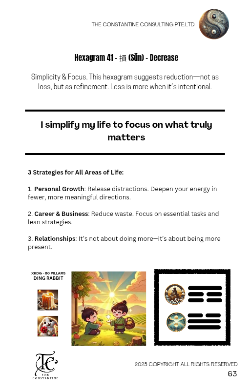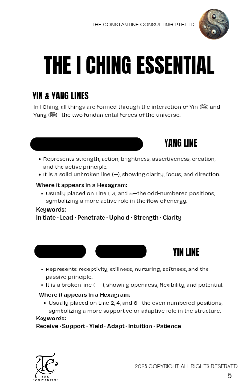 Created by Sandra Constantine, founder of The Constantine Consulting Pte. Ltd., this book blends ancient metaphysics with practical coaching insight. Each of the 64 hexagrams is distilled into clear themes, powerful affirmations, and actionable strategies—so you can align your mindset, make better decisions, and navigate life’s cycles with confidence.