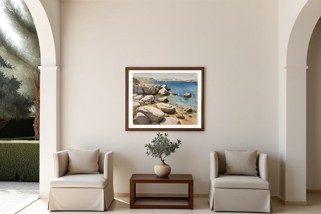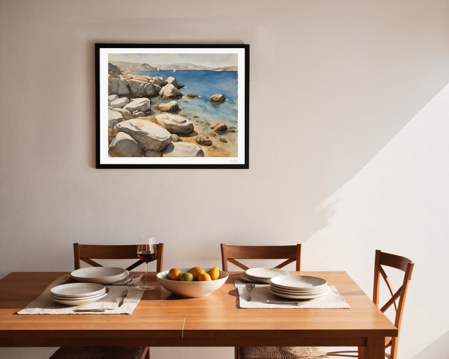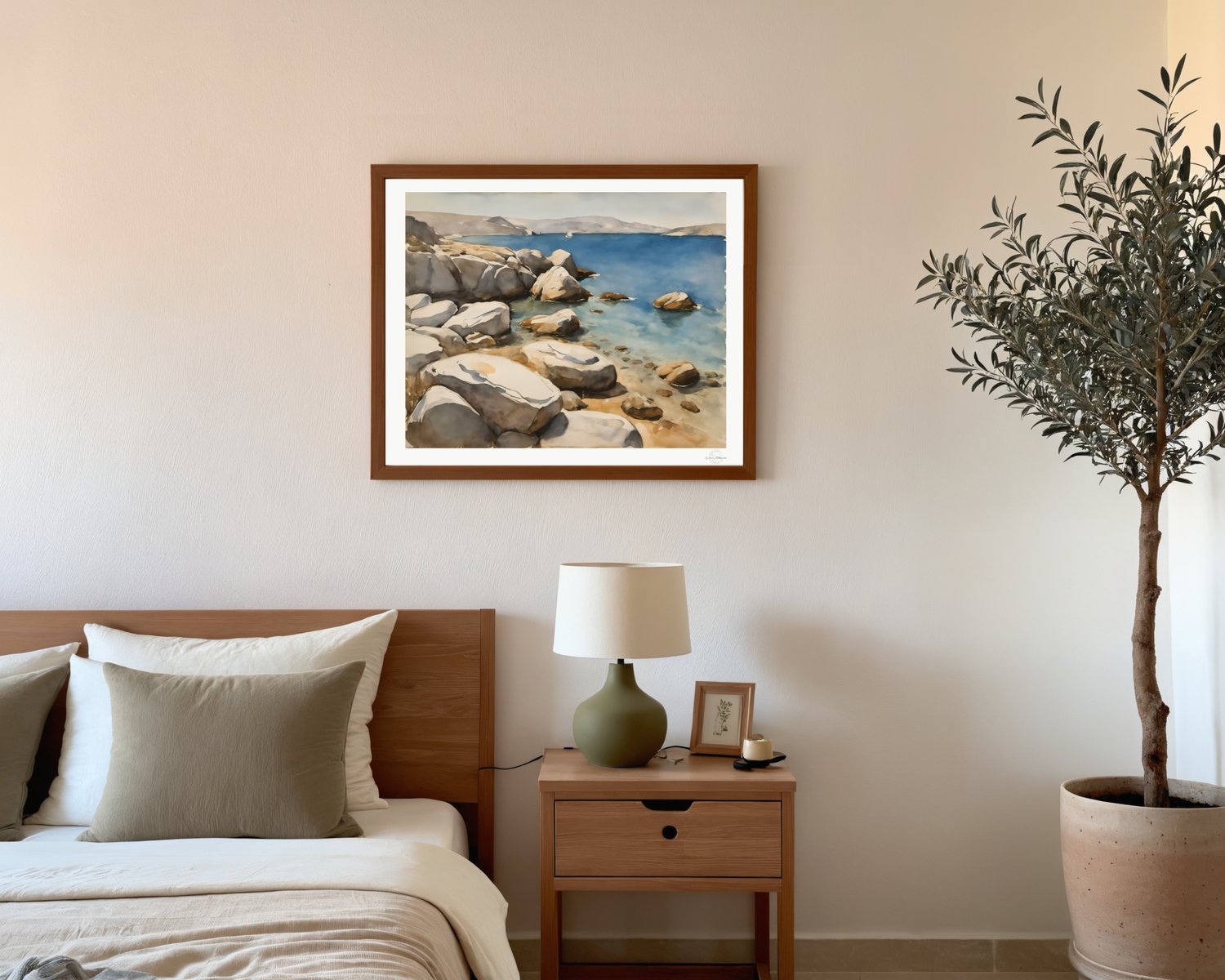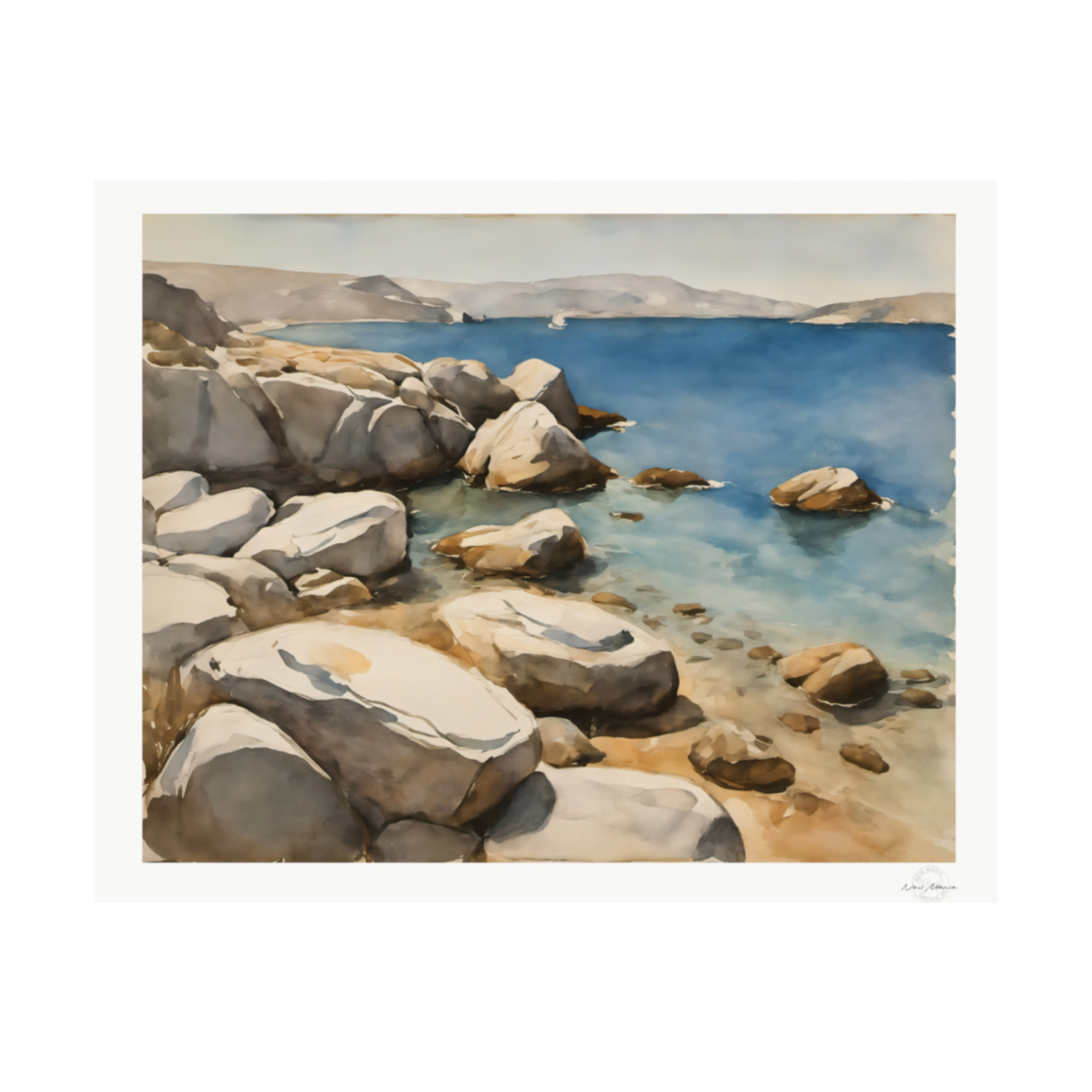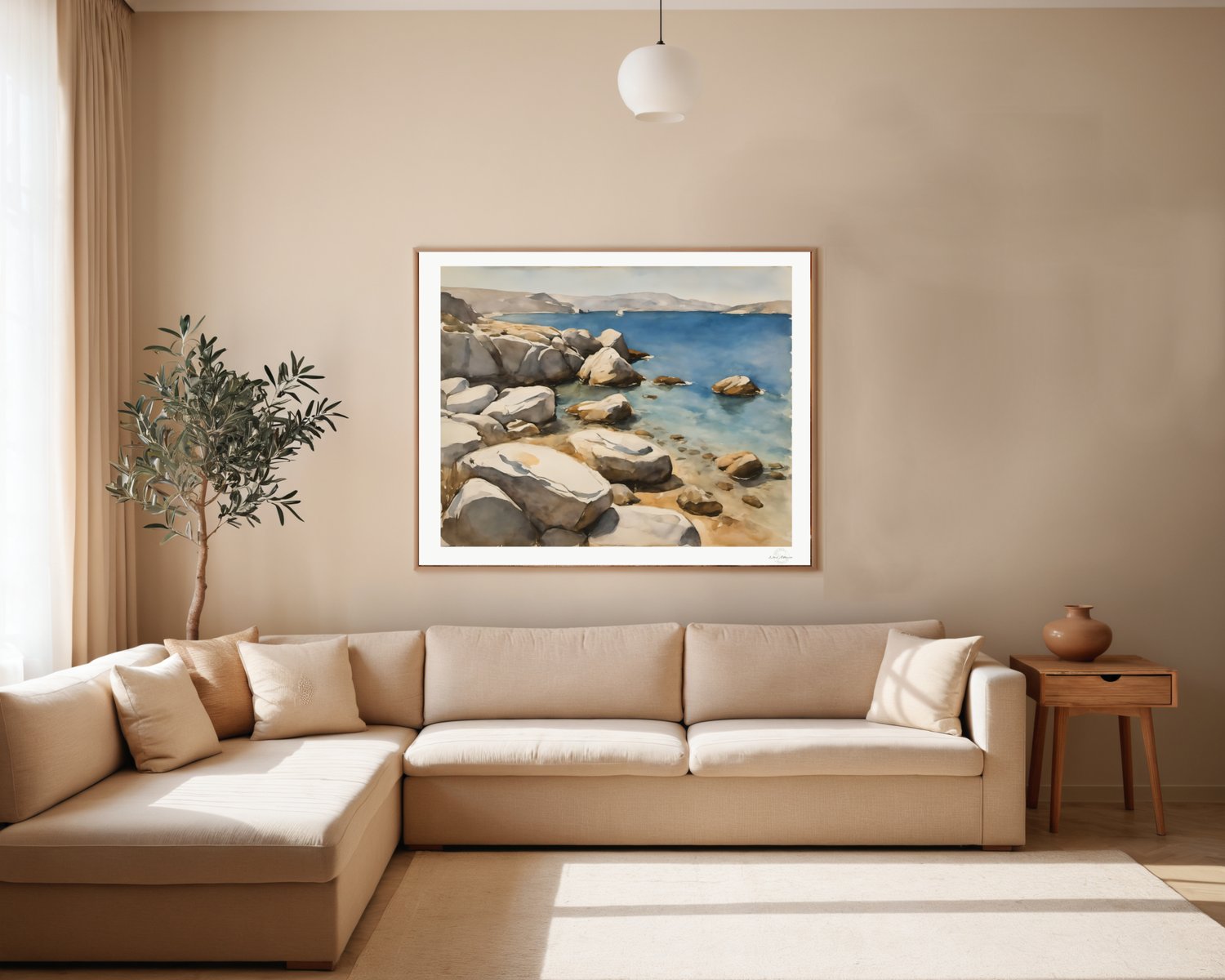 A calm coastal scene featuring sunlit rocks and clear blue water, painted in soft, natural tones. This printable artwork captures the quiet rhythm of the shoreline and brings a sense of openness and stillness to any space.
