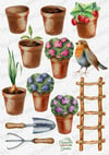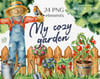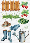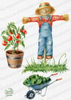 Gardening collection: scarecrow, shovel, gloves, clay pots with flowers, bird robin, fence, rubber boots, hat, watering can, stairs, a small rake, wheelbarrow, green grass, tomatoes, strawberry