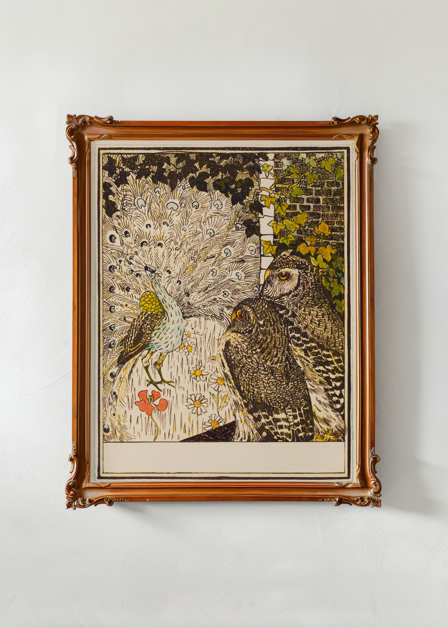 Showing Off Peacock and Two Owls— A peacock unfurls its splendid tail, jeweled feathers fanned in quiet display, while two owls look on with steady, knowing eyes. In Showing Off Peacock and Two Owls, Theo Van Hoytema brings together grace and stillness, light and shadow—each creature a reflection of beauty in contrast. The scene hums with quiet symbolism: pride and wisdom side by side, nestled in the hush of nature’s gaze.
