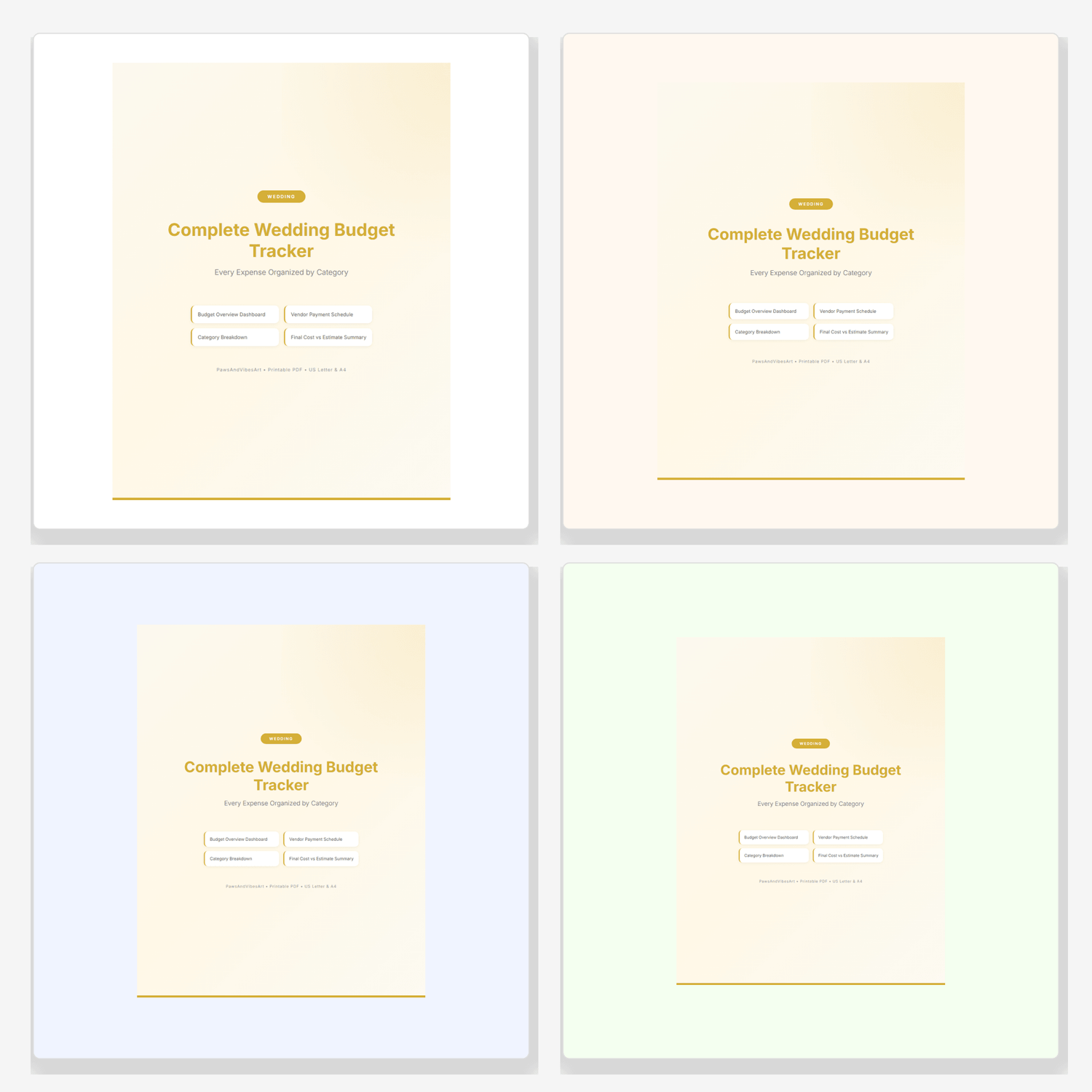 Every wedding expense organized by category. Budget Overview Dashboard. Vendor Payment Schedule. Category Breakdown (Venue, Catering, Flowers, Photography, Music, Decor). Final Cost vs Estimate Summary. Perfect for engaged couples planning their dream wedding. US Letter & A4 PDF. Instant download. PawsAndVibesArt