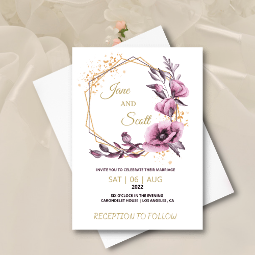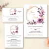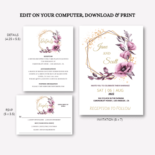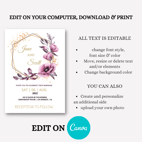 This Wedding Invitation Set template is a fully editable, floral & gold geometric design. Includes RSVP/Reply card and Details /Information Card. Personalize your template in CANVA, an easy to use template editor that works in your web browser.