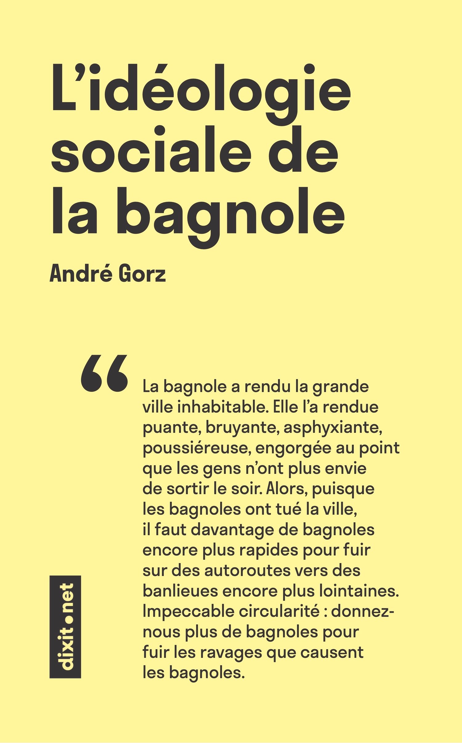 "La bagnole a rendu la grande ville inhabitable. Elle l’a rendue puante, bruyante, asphyxiante, poussiéreuse, engorgée au point que les gens n’ont plus envie de sortir le soir. Alors, puisque les bagnoles ont tué la ville, il faut davantage de bagnoles encore plus rapides pour fuir sur des autoroutes vers des banlieues encore plus lointaines. Impeccable circularité : donnez-nous plus de bagnoles pour fuir les ravages que causent les bagnoles."