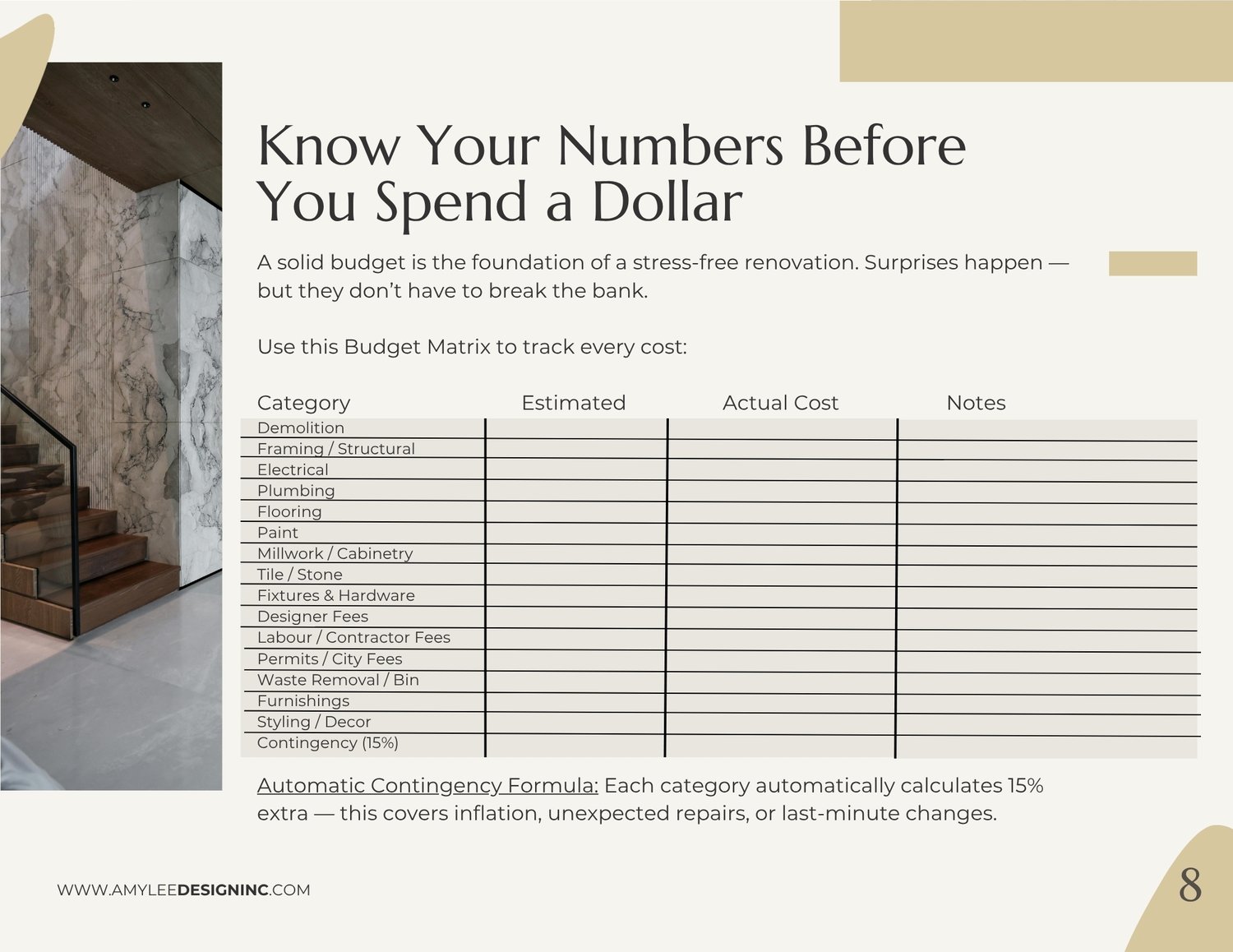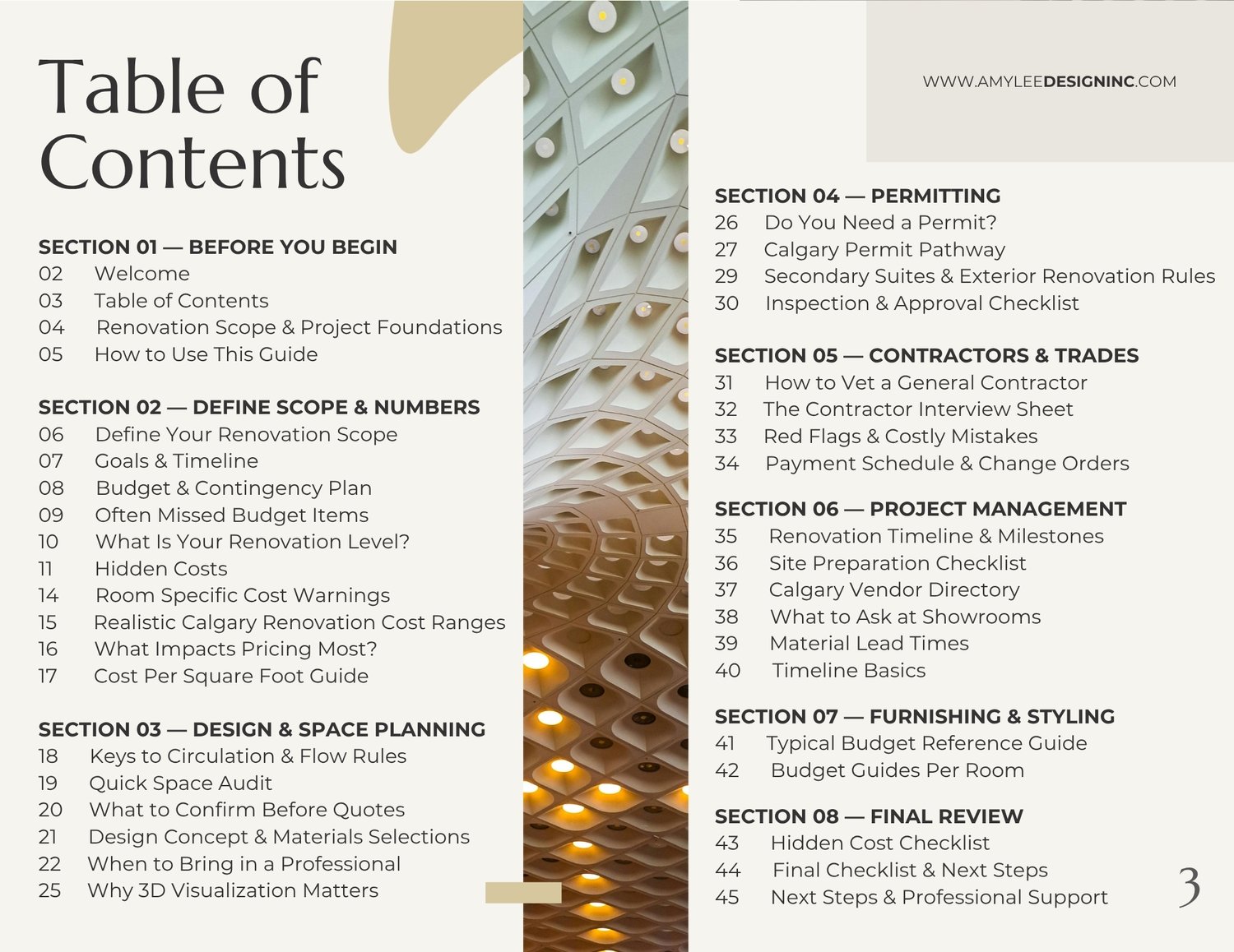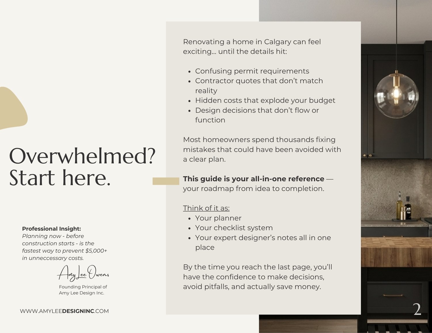 The Calgary Renovation Bible is a professionally created digital PDF guide by Amy Lee Design Inc., designed specifically for Calgary homeowners planning a kitchen renovation, bathroom remodel, basement development, flooring upgrade, or full-home renovation.