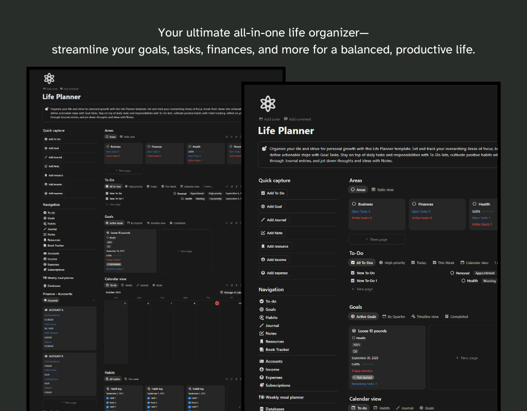 - Organize Your Knowledge & Growth: Keep your mind sharp with a centralized system for everything. The Notes database lets you capture ideas and organize information, while the Resources library saves all your valuable links and articles.