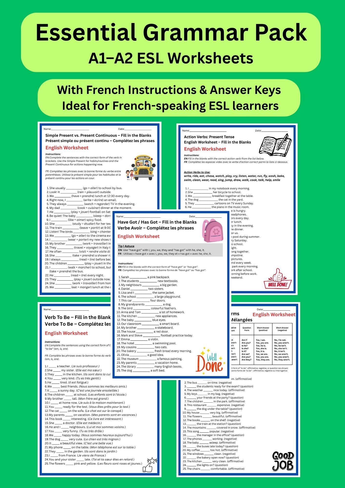 This ESL Grammar Worksheet Bundle includes 5 printable worksheets designed for beginner ESL learners (A1–A2 level). Each worksheet focuses on essential grammar topics and includes clear instructions and answer keys with French translations, perfect for French-speaking students.