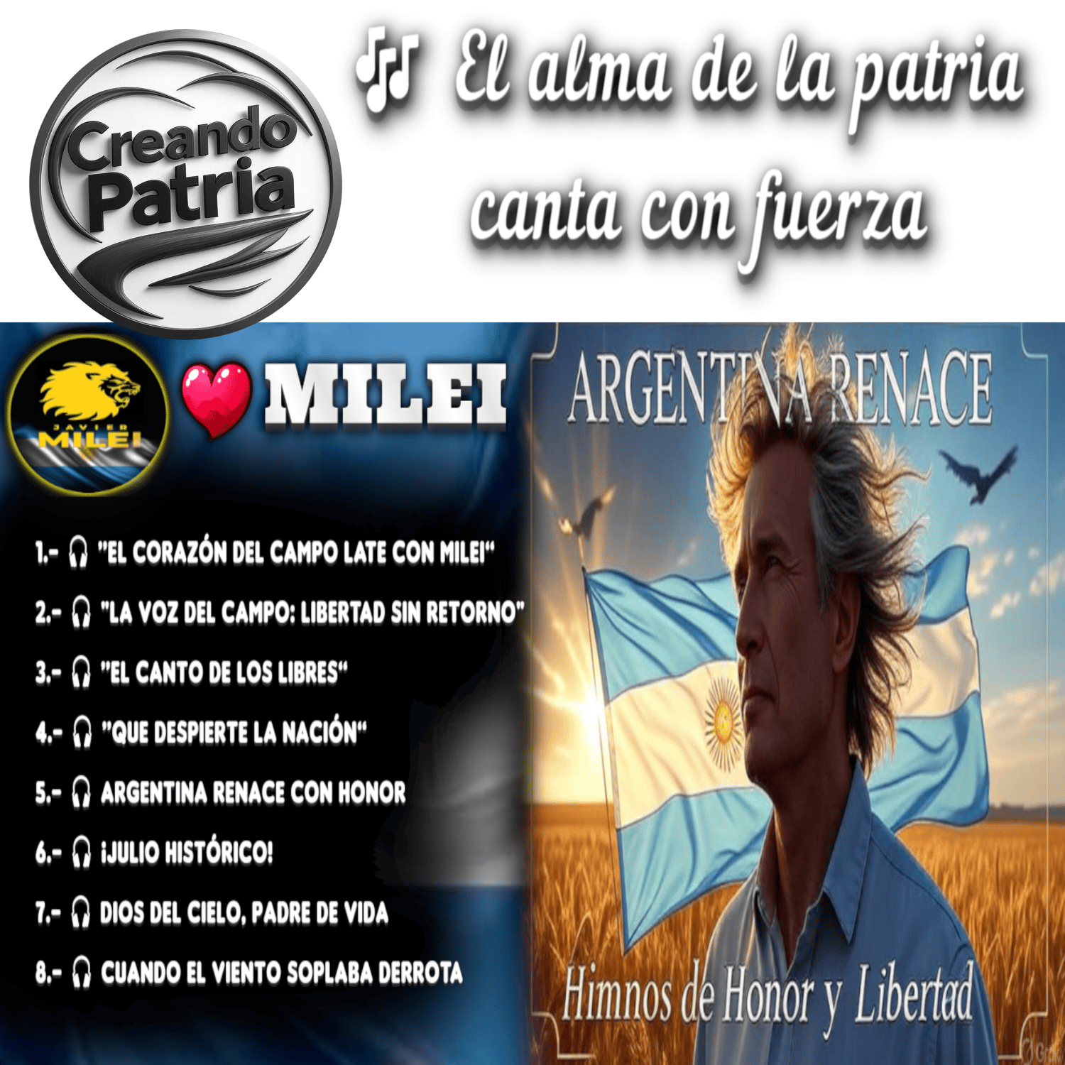 Este álbum reúne las canciones más emotivas, combativas y esperanzadoras del nuevo despertar argentino. Desde el clamor del campo hasta la plegaria al Dios del cielo, cada tema es una declaración de amor a la libertad, al trabajo digno y a una nación que vuelve a ponerse de pie.