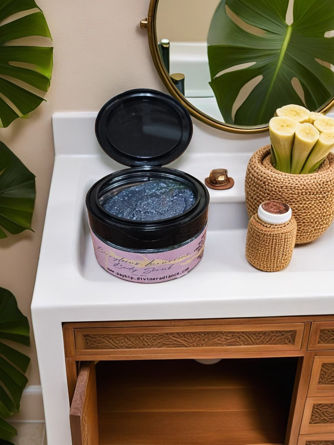 Ingredients: fine pink Himalayan salt (gentle exfoliation and mineral replenishment,) Dead Sea salt, coconut oil, sweet almond oil or jojoba oil, berry fragrance oil, mica powder