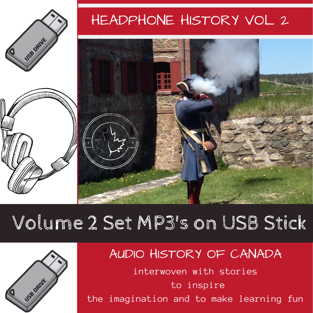 4 GB USB Stick with Headphone History Volume 2 Audiobook Files with key tag label. Canadian history told with stories and legends to make learning fun and interesting.