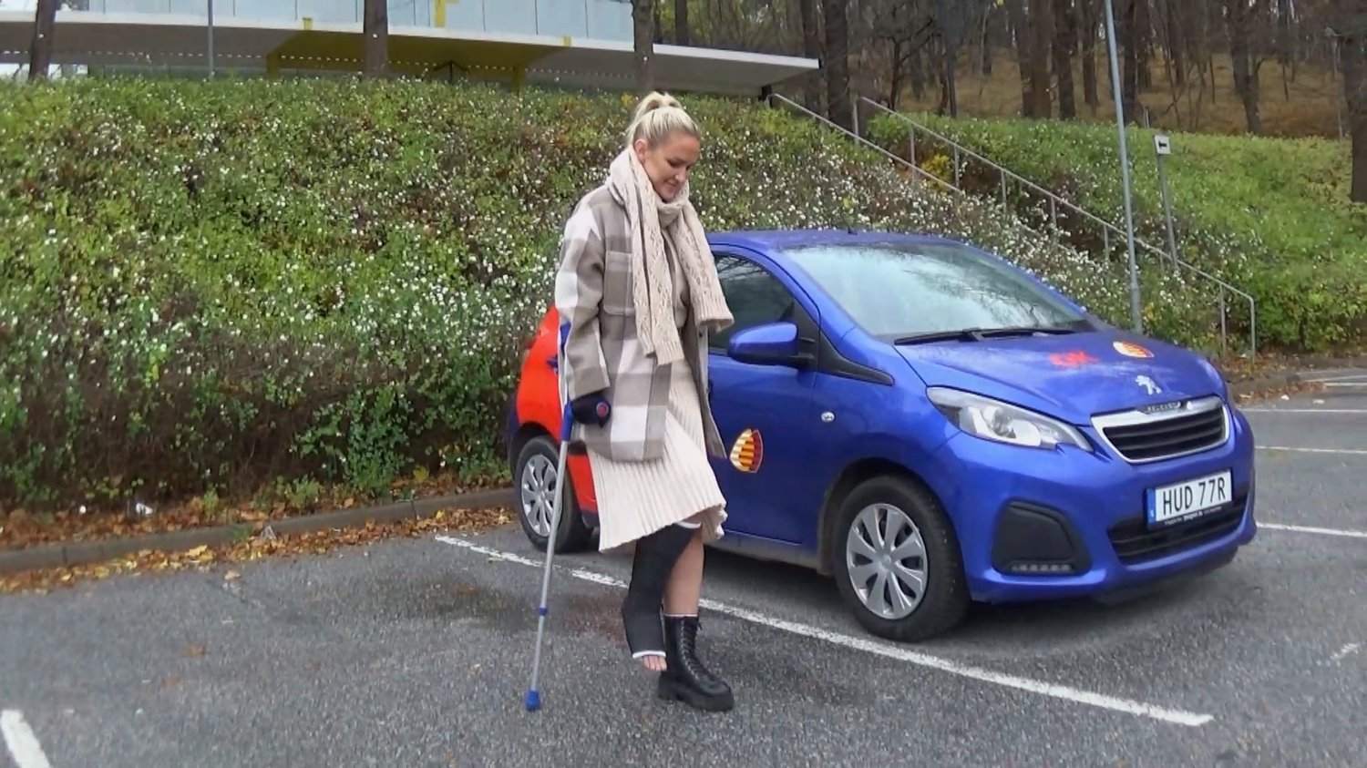 Ebba´s right leg is broken and casted in a black SLC. Ebba wears a beautiful fall outfit that goes with a black heels on her left foot. It’s rainy, wet and slippery outside but Ebba is being careful not to fall and hurt herself while crutching.