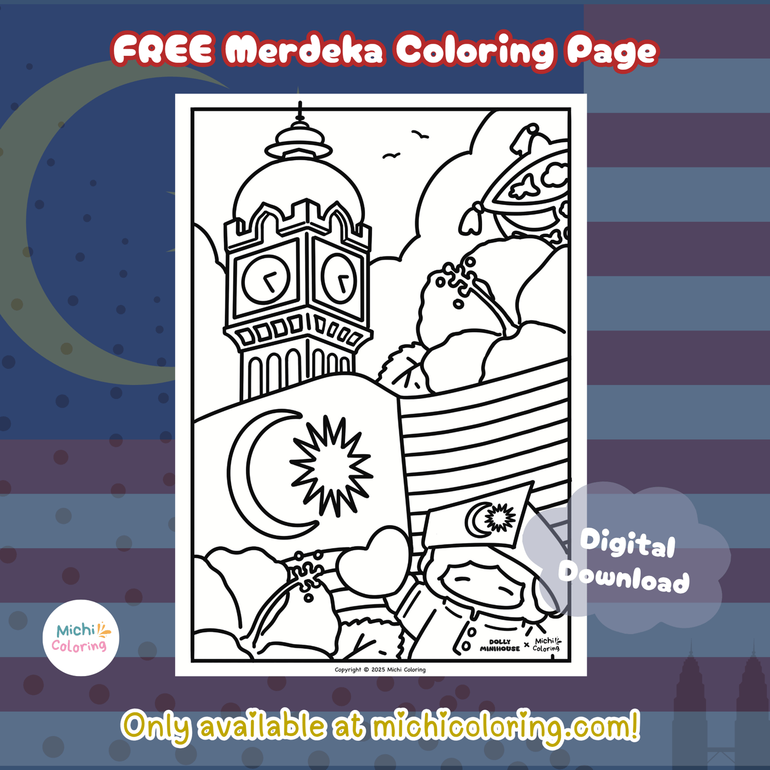 Free Merdeka (Malaysian Independence Day on 31st August) Coloring Page to download! Don't forget to tag us @michi.coloring & share your lovely art piece.