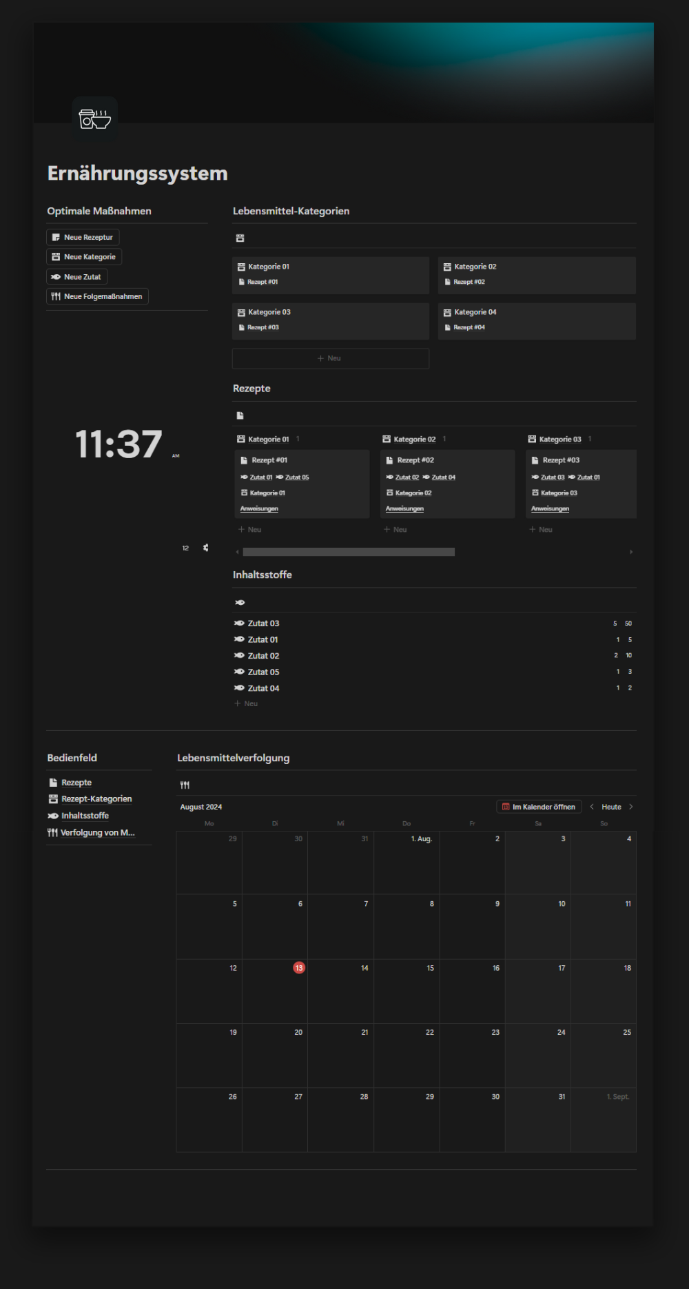 - Zutatenverwaltung: Führen Sie ein detailliertes Verzeichnis der von Ihnen verwendeten Zutaten mit Informationen über Mengen und Nährwerteigenschaften.