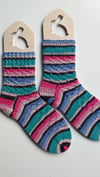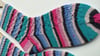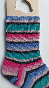 Inspired by the lead work windows found in the many National Trust properties we’ve visited I found out that the diamond shaped leaded ones were known as quarrels or quarries. Glass divided by either wooden glazing bars or lead canes. I have used a simple two stitch cable, without a cable needle in sight to recreate the shape. The ones shown are in Sirdar Heart and Sole yarn in the colourway Twist & Shout.