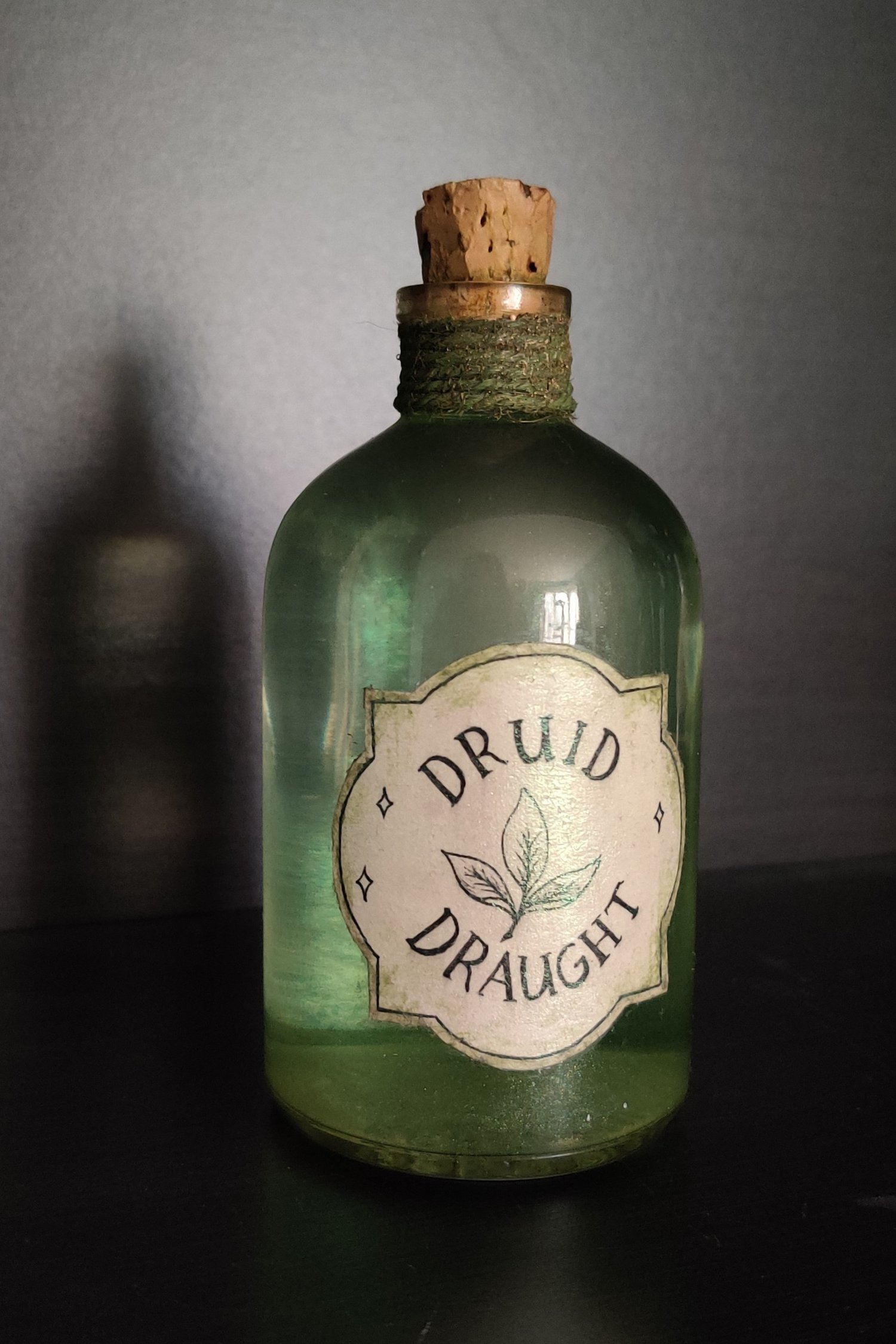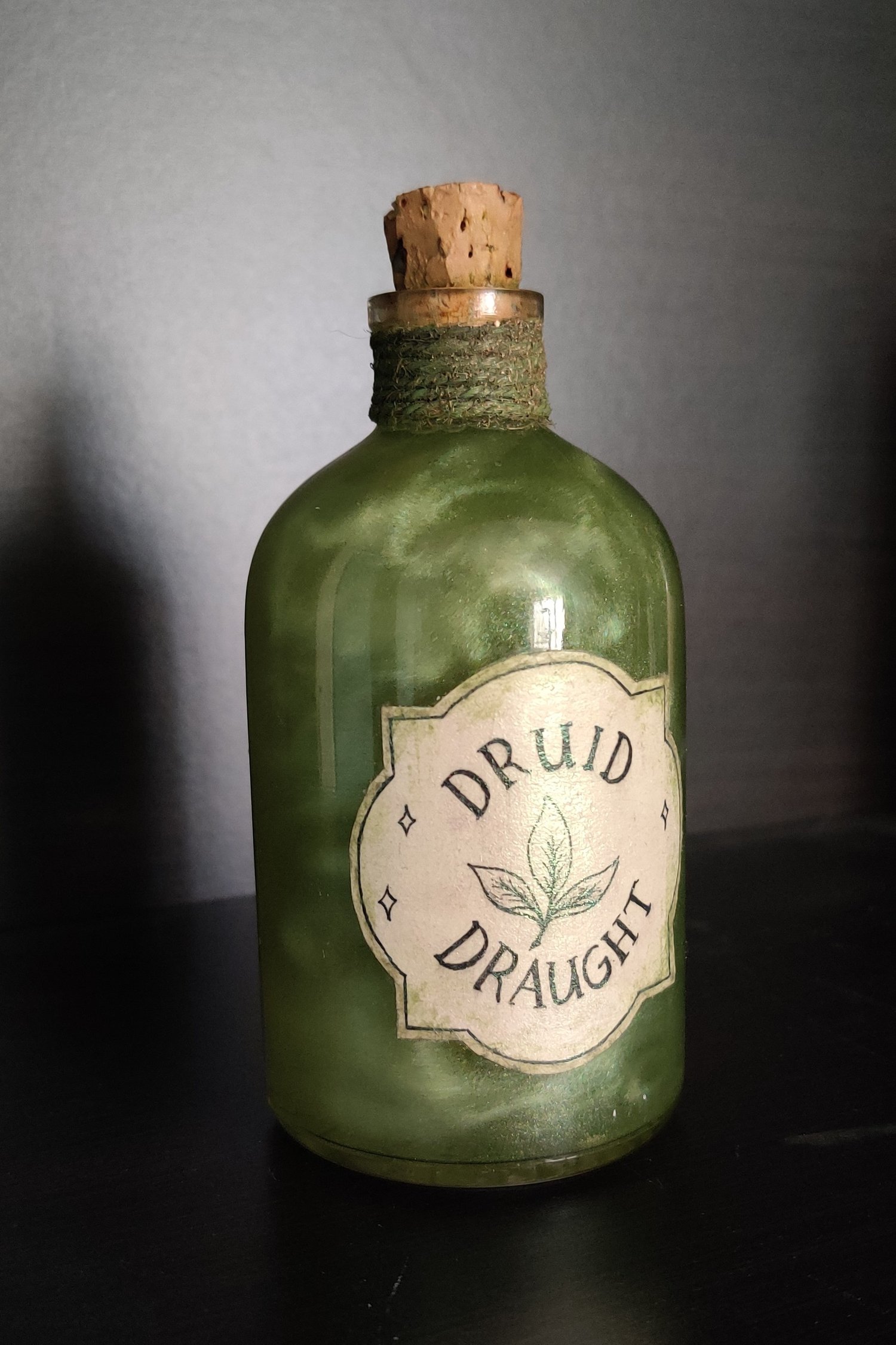 Pullossa on vihertävää nestettä ja se on koristeltu käsintehdyllä etiketillä ja värjätyllä juuttinarulla.